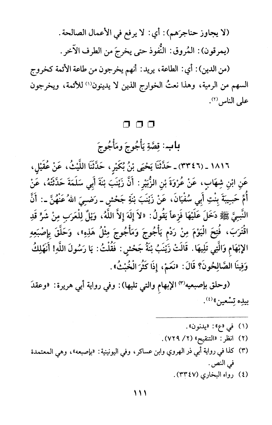 1816 - (3346) - حَدَّثَنَا يَحْيَىَ بْنُ بُكَيْرٍ، حَدَّثَنَا اللَّيْثُ، عَنْ عُقَيْلٍ، عَنِ ابْنِ شِهَابٍ، عَنْ عُرْوَةَ بْنِ الزُّبَيْرِ: أَنَّ زَيْنَبَ بْنَةَ أَبِي سَلَمَةَ حَدَّثَتْهُ، عَنْ أُمِّ حَبِيبَةَ بِنْتِ أَبِي سُفْيَانَ، عَنْ زَيْنَبَ بْنَةِ جَحْشٍ -رَضِيَ اللهُ عَنْهُنَّ-: أَنَّ النَّبِيَّ - صلى الله عليه وسلم - دَخَلَ عَلَيْهَا فَزِعاً يَقُولُ: "لاَ إِلَهَ إِلاَّ اللهُ، وَيْلٌ لِلْعَرَبِ مِنْ شَرٍّ قَدِ اقْتَرَبَ، فُتِحَ الْيَوْمَ مِنْ رَدْمِ يَأْجُوجَ وَمَاْجُوجَ مِثلُ هَذِهِ"، وَحَلَّقَ بِإِصْبَعِهِ الإِبْهَامِ وَالَّتِي تَلِيهَا. قَالَتْ زَيْنَبُ بْنَةُ جَحْشٍ: فَقُلْتُ: يَا رَسُولَ اللهِ! أَنَهْلِكُ وَفِينَا الصَّالِحُونَ؟ قالَ: "نَعَمْ، إِذَا كَثُرَ الْخُبْثُ".