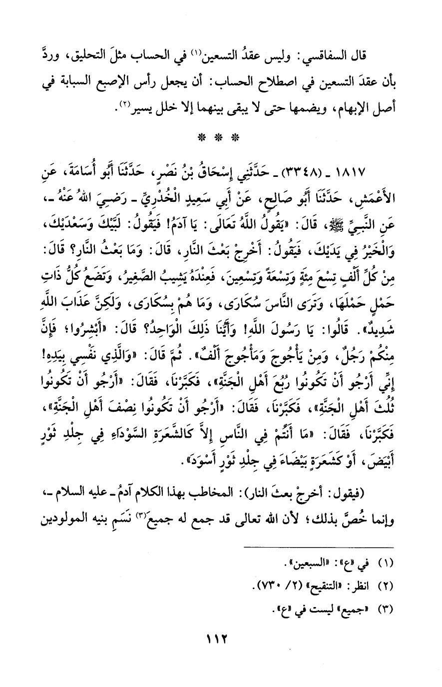 1817 - (3348) - حَدَّثَنِي إِسْحَاقُ بْنُ نَصْرٍ، حَدَّثَنَا أَبُو أُسَامَةَ، عَنِ الأَعْمَشِ، حَدَّثَنَا أَبُو صَالِحٍ، عَنْ أَبِي سَعِيدٍ الْخُدْرِيِّ -رَضِيَ اللهُ عَنْهُ-، عَنِ النَّبِيِّ - صلى الله عليه وسلم -، قَالَ: "يَقُولُ اللهُ تَعَالَى: يَا آدَمُ! فَيَقُولُ: لَبَّيْكَ وَسَعْدَيْكَ، وَالْخَيْرُ فِي يَدَيْكَ، فَيَقُولُ: أَخْرِجْ بَعْثَ النَّارِ، قَالَ: وَمَا بَعْثُ النَّارِ؟ قَالَ: مِنْ كُلِّ أَلْفٍ تِسْعَ مِئَةٍ وَتِسْعَةً وَتِسْعِينَ، فَعِنْدَهُ يَشِيبُ الصَّغِيرُ، وَتَضَعُ كُلُّ ذَاتِ حَمْلٍ حَمْلَهَا، وَتَرَى النَّاسَ سُكَارَى، وَمَا هُمْ بِسُكَارَى، وَلَكِنَّ عَذَابَ اللهِ شَدِيدٌ". قَالُوا: يَا رَسُولَ اللهِ! وَأَيُّنَا ذَلِكَ الْوَاحِدُ؟ قَالَ: "أَبْشِرُوا؛ فَإِنَّ مِنْكُمْ رَجُلٌ، وَمِنْ يَأْجُوجَ وَمَأْجُوجَ أَلْفٌ". ثُمَّ قَالَ: "وَالَّذِي نَفْسِي بِيَدِهِ! إِنِّي أَرْجُو أَنْ تَكُونُوا رُبُعَ أَهْلِ الْجَنَّةِ"، فَكَبَّرْناَ، فَقَالَ: "أَرْجُو أَنْ تَكُونُوا ثُلُثَ أَهْلِ الْجَنَّةِ"، فَكَبَّرْناَ، فَقَالَ: "أَرْجُو أَنْ تَكُونُوا نِصْفَ أَهْلِ الْجَنَّةِ"، فَكَبَّرْناَ، فَقَالَ: "مَا أَنْتُمْ فِي النَّاسِ إِلاَّ كَالشَّعَرَةِ السَّوْدَاءِ فِي جِلْدِ ثَوْرٍ أَبْيَضَ، أَوْ كَشَعَرَةٍ بَيْضَاءَ فِي جِلْدِ ثَوْرٍ أَسْوَدَ".