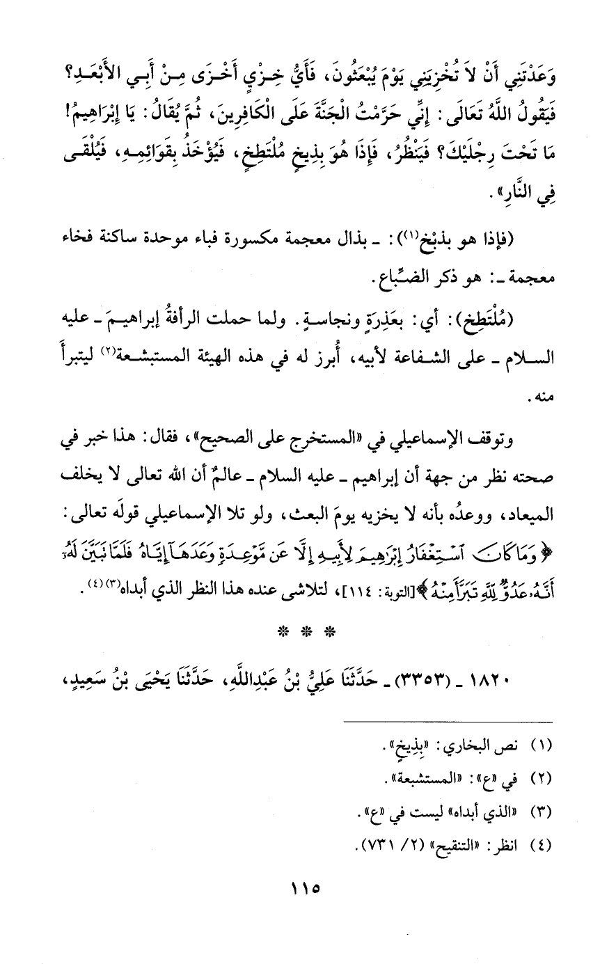 وتوقف الإسماعيلي في "المستخرج على الصحيح"، فقال: هذا خبر في صحته نظر من جهة أن إبراهيم -عليه السلام- عالمٌ أن الله تعالى لا يخلف الميعاد، ووعدُه بأنه لا يخزيه يومَ البعث، ولو تلا الإسماعيلي قولَه تعالى: {وَمَا كَانَ اسْتِغْفَارُ إِبْرَاهِيمَ لِأَبِيهِ إِلَّا عَنْ مَوْعِدَةٍ وَعَدَهَا إِيَّاهُ فَلَمَّا تَبَيَّنَ لَهُ أَنَّهُ عَدُوٌّ لِلَّهِ تَبَرَّأَ مِنْهُ} [التوبة: 114]، لتلاشى عنده هذا النظر الذي أبداه (¬3) (¬4).