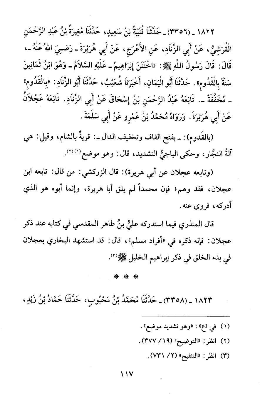 1822 - (3356) - حَدَّثَنَا قُتَيْبَةُ بْنُ سَعِيدٍ، حَدَّثَنَا مُغِيرَةُ بْنُ عَبْدِ الرَّحْمَنِ الْقُرَشِيُّ، عَنْ أَبِي الزِّنَادِ، عَنِ الأَعْرَجِ، عَنْ أَبِي هُرَيْرَةَ - رضي الله عنه -، قَالَ: قَالَ رَسُولُ اللَّهِ - صلى الله عليه وسلم -: "اخْتَتَنَ إِبْرَاهِيمُ -عَلَيْهِ السَّلاَمُ- وَهْوَ ابْنُ ثَمَانِينَ سَنَةً بِالْقَدُومِ". حَدَّثَنَا أبو الْيَمَانِ، أَخْبَرَناَ شُعَيْبٌ، حَدَّثَنَا أبو الزِّناَدِ: "بِالْقَدُومِ" -مُخَفَّفَةً-. تَابَعَهُ عَبْدُ الرَّحْمَنِ بْنُ إِسْحَاقَ عَنْ أَبي الزِّناَدِ. تَابَعَهُ عَجْلاَنُ عَنْ أَبِي هُرَيْرَةَ. وَرَوَاهُ مُحَمَّدُ بْنُ عَمْرٍو عَنْ أَبِي سَلَمَةَ.