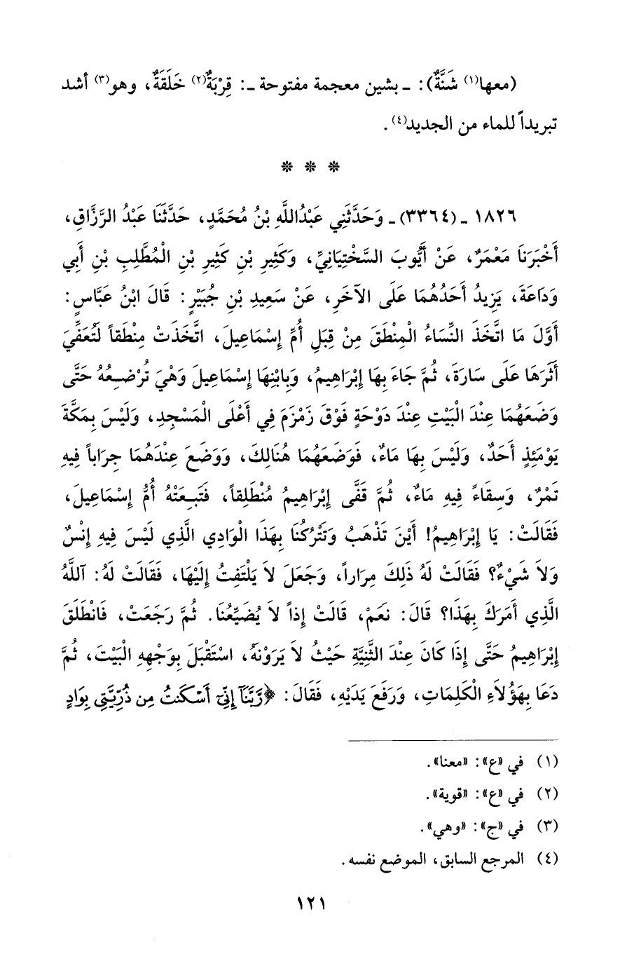 1826 - (3364) - وَحَدَّثَنِي عَبْدُ اللَّهِ بْنُ مُحَمَّدٍ، حَدَّثَنَا عَبْدُ الرَّزَّاقِ، أَخْبَرَنَا مَعْمَر، عَنْ أيُّوبَ السَّخْتِيَانِيِّ، وَكثِيرِ بْنِ كثِيرِ بْنِ الْمُطَّلِبِ بْنِ أَبي وَداعَةَ، يَزِيدُ أَحَدُهُمَا عَلَى الآخَرِ، عَنْ سَعِيدِ بْنِ جُبَيْرٍ: قَالَ ابْنُ عَبَّاس: أَوَّلَ مَا اتَّخَذَ النِّسَاءُ الْمِنْطَقَ مِنْ قِبَلِ أُمِّ إِسْمَاعِيلَ، اتَّخَذَتْ مِنْطَقًا لتُعَفِّيَ أثرَهَا عَلَى سَارَةَ، ثمَّ جَاءَ بِهَا إِبْرَاهِيمُ، وَبِابْنِهَا إِسْمَاعِيلَ وَهْيَ تُرْضِعُهُ حَتَّى وَضَعَهُمَا عِنْدَ الْبَيْتِ عِنْدَ دَوْحَةٍ فَوْقَ زَمْزَمَ فِي أَعْلَى الْمَسْجِدِ، وَلَيْسَ بِمَكَّةَ يَوْمَئِذٍ أَحَد، وَلَيْسَ بِهَا مَاء، فَوَضَعَهُمَا هُنَالِكَ، وَوَضَعَ عِنْدَهُمَا جِرَابًا فِيهِ تَمْرٌ، وَسِقَاءً فِيهِ مَاء، ثمَّ قَفَّى إِبْرَاهِيمُ مُنْطَلِقًا، فتَبِعَتْهُ أُمُّ إِسْمَاعِيلَ، فَقَالَتْ: يَا إِبْرَاهِيمُ! أَيْنَ تَذْهَبُ وَتترُكنَا بِهَذَا الْوَادِي الَّذِي لَيْسَ فِيهِ إِنْس وَلَا شَيْء؟ فَقَالَتْ لَهُ ذَلِكَ مِرَارًا، وَجَعَلَ لَا يَلْتَفِتُ إِلَيْهَا، فَقَالَتْ لَهُ: آللَّهُ الَّذِي أَمَرَكَ بِهَذَا؟ قَالَ: نعمْ، قَالَتْ إِذًا لَا يُضَيِّعُنَا. ثمَّ رَجَعَتْ، فَانْطَلَقَ إِبْرَاهِيمُ حَتَّى إِذَا كَانَ عِنْدَ الثَّنِيَّةِ حَيْثُ لَا يَرَوْنَهُ، اسْتَقْبَلَ بِوَجْهِهِ الْبَيْتَ، ثمَّ دَعَا بِهَؤُلَاءَ الْكَلِمَاتِ، وَرَفَعَ يَدَيْهِ، فَقَالَ: {رَبَّنَا إِنِّي أَسْكَنْتُ مِنْ ذُرِّيَّتِي بِوَادٍ