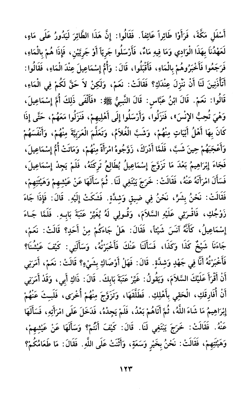 أَسْفَلِ مَكَّةَ، فَرَأَوْا طَائِرًا عَائِفًا. فَقَالُوا: إِنَّ هَذَا الطَّائِرَ لَيَدُورُ عَلَى مَاءٍ، لَعَهْدُنَا بِهَذَا الْوَادِي وَمَا فِيهِ مَاءٌ، فَأَرْسَلُوا جَرِيًّا أَوْ جَرِيَّيْنِ، فَإِذَا هُمْ بِالْمَاء، فَرَجَعُوا فَأَخْبَرُوهُمْ بِالْمَاء، فَأَقْبَلُوا، قَالَ: وَأُمُّ إِسْمَاعِيلَ عِنْدَ الْمَاء، فَقَالُوا: أتأذَنِينَ لَنَا أَنْ ننزِلَ عِنْدَكِ؟ فَقَالَتْ: نعمْ، وَلَكِنْ لَا حَقَّ لَكُمْ فِي الْمَاء، قَالُوا: نعمْ. قَالَ ابْنُ عَبَّاسٍ: قَالَ النَّبِيُّ - صلى الله عليه وسلم -: "فَأَلْفَى ذَلِكَ أُمَّ إِسْمَاعِيلَ، وَهْيَ تُحِبُّ الإنْسَ"، فَنَزَلُوا، وَأَرْسَلُوا إِلَى أَهْلِيهِمْ، فَنَزَلُوا مَعَهُمْ، حَتَّى إِذَا كَانَ بِهَا أَهْلُ أَبْيَاتٍ مِنْهُمْ، وَشَبَّ الْغُلَامُ، وَتَعَلَّمَ الْعَرَبِيَّة مِنْهُمْ، وَأَنْفَسَهُمْ وَأَعْجَبَهُمْ حِينَ شَبَّ، فَلَمَّا أَدْرَكَ، زَوَّجُوهُ امْرَأَةً مِنْهُمْ، وَمَاتَتْ أُمُّ إِسْمَاعِيلَ، فَجَاءَ إِبْرَاهِيمُ بَعْدَ مَا تَزَوَّجَ إِسْمَاعِيلُ يُطَالِعُ تَرِكتهُ، فَلَمْ يَجدْ إِسْمَاعِيلَ، فَسَأَلَ امْرَأتهُ عَنْهُ، فَقَالَتْ: خَرَجَ يَبْتَغِي لَنَا. ثُمَّ سَألَهَا عَنْ عَيْشِهِمْ وَهَيْئَتِهِمْ، فَقَالَتْ: نَحْنُ بِشَرٍّ، نَحْنُ فِي ضِيقٍ وَشِدَّةٍ. فَشَكَتْ إِلَيْهِ. قَالَ: فَإِذَا جَاءَ زَوْجُكِ، فَاقْرَئِي عَلَيْهِ السَّلَامَ، وَقُولي لَهُ يُغَيِّرْ عَتَبَةَ بَابِهِ. فَلَمَّا جَاءَ إِسْمَاعِيلُ، كَأَنَّهُ آنس شَيْئًا، فَقَالَ: هَلْ جَاءكمْ مِنْ أَحَدٍ؟ قَالَتْ: نعمْ، جَاءَنَا شيخٌ كَذَا وَكَذَا، فَسَألنَا عَنْكَ فَأَخْبَرْتُهُ، وَسَأَلَنِي: كَيْفَ عَيْشُنَا؟ فَأَخْبَرْتُهُ أَنَّا فِي جَهْدٍ وَشِدَّةٍ. قَالَ: فَهَلْ أَوْصَاكِ بِشَيْءَ؟ قَالَتْ: نعَمْ، أَمَرَنِي أَنْ أَقْرَأَ عَلَيْكَ السَّلَامَ، وَيَقُولُ: غَيِّرْ عَتَبةَ بَابِكَ. قَالَ: ذَاكِ أَبي، وَقَدْ أَمَرَنِي أَنْ أفُارِقَكِ، الْحَقِي بأَهْلِكِ. فَطَلَّقَهَا، وَتَزَوَّجَ مِنْهُمْ أُخْرَى، فَلَبِثَ عَنْهُمْ إِبْرَاهِيمُ مَا شاءَ اللَّهُ، ثُمَّ أتاهُمْ بَعْدُ، فَلَمْ يجِدْهُ، فَدَخَلَ عَلَى امْرَأَتِهِ، فَسَأَلَهَا عَنْهُ. فَقَالَتْ: خَرَجَ يَبْتَغِي لَنَا. قَالَ: كيْفَ أَنتمْ؟ وَسَأَلَهَا عَنْ عَيْشِهِمْ، وَهَيْئتَهِمْ، فَقَالَتْ: نَحْن بِخَيْرٍ وَسَعَةٍ، وَأثنَتْ عَلَى اللَّهِ. فَقَالَ: مَا طَعَامُكُمْ؟