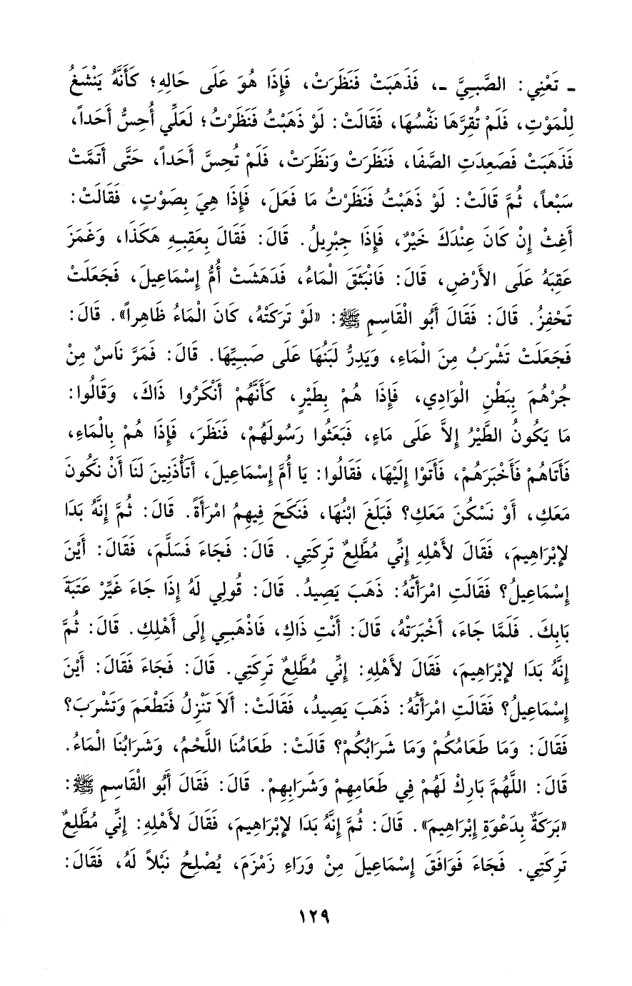 -تَعْنِي: الصَّبِيَّ-، فَذَهَبَتْ فَنَظَرَتْ، فَإِذَا هُوَ عَلَى حَالِهِ؛ كأَنَّهُ يَنْشَغُ لِلْمَوْتِ، فَلَمْ تُقِرَّهَا نَفْسُهَا، فَقَالَتْ: لَوْ ذَهَبْتُ فَنَظَرْتُ؛ لَعَلِّي أُحِسُّ أَحَدًا، فَذَهَبَتْ فَصَعِدَتِ الصَّفَا، فَنَظَرَتْ وَنَظَرَتْ، فَلَمْ تُحِسَّ أَحَدًا، حَتَّى أتمَّتْ سَبْعًا، ثُمَّ قَالَتْ: لَوْ ذَهَبْتُ فَنَظَرْتُ مَا فَعَلَ، فَإِذَا هِيَ بِصَوْتٍ، فَقَالَتْ: أَغِثْ إِنْ كَانَ عنْدَكَ خَيْر، فَإِذَا جِبْرِيلُ. قَالَ: فَقَالَ بِعَقِبِهِ هَكَذَا، وَغَمَزَ عَقِبَهُ عَلَى الأَرْضِ، قَالَ: فَانْبَثَقَ الْمَاءُ، فَدَهشَتْ أُمُّ إِسْمَاعِيلَ، فَجَعَلَتْ تَحْفِزُ. قَالَ: فَقَالَ أَبُو الْقَاسِم - صلى الله عليه وسلم -: "لَوْ تَرَكَتْهُ، كَانَ الْمَاءُ ظَاهِرًا". قَالَ: فَجَعَلَتْ تَشْرَبُ مِنَ الْمَاءَ، وَيَدِرُّ لَبَنُهَا عَلَى صَبِيِّهَا. قَالَ: فَمَرَّ نَاس مِنْ جُرْهُمَ بِبَطْنِ الْوَادِي، فَإِذَا هُمْ بِطَيْرٍ، كأَنَّهُمْ أَنْكَرُوا ذَاكَ، وَقالُوا: مَا يَكُونُ الطَّيْرُ إِلَّا عَلَى مَاءٍ، فَبَعَثُوا رَسُولَهُمْ، فَنَظَرَ، فَإِذَا هُمْ بِالْمَاءِ، فَأَتَاهُمْ فَأَخْبَرَهُمْ، فَأَتَوْا إِلَيْهَا، فَقَالُوا: يَا أُمَّ إِسْمَاعِيلَ، أتأْذَنِينَ لَنَا أَنْ نَكُونَ مَعَكِ، أَوْ نسكُنَ مَعَكِ؟ فَبَلَغَ ابْنُهَا، فَنَكَحَ فِيهِمُ امْرَأَةً. قَالَ: ثُمَّ إِنَّهُ بَدَا لإبْرَاهِيمَ، فَقَالَ لأَهْلِهِ إِنِّي مُطَّلِعٌ ترِكَتِي. قَالَ: فَجَاءَ فَسَلَّمَ، فَقَالَ: أَيْنَ إِسْمَاعِيلُ؟ فَقَالَتِ امْرَأتهُ: ذَهَبَ يَصِيدُ. قَالَ: قُولي لَهُ إِذَا جَاءَ غَيِّرْ عَتَبةَ بَابِكَ. فَلَمَّا جَاءَ، أَخْبَرَتهُ، قَالَ: أَنْتِ ذَاكِ، فَاذْهَبِي إِلَى أَهْلِكِ. قالَ: ثُمَّ إِنَّهُ بَدَا لإبْرَاهِيمَ، فَقَالَ لأَهْلِهِ: إِنِّي مُطَّلِع تَرِكَتي. قَالَ: فَجَاءَ فَقَالَ: أَيْنَ إِسْمَاعِيلُ؟ فَقَالَتِ امْرَأتهُ. ذَهَبَ يَصِيدُ، فَقَالَتْ: أَلَا تَنْزِلُ فتَطْعَمَ وَتَشْرَبَ؟ فَقَالَ: وَمَا طَعَامُكُمْ وَمَا شَرَابُكُمْ؟ قَالَتْ: طَعَامُنَا اللَّحْمُ، وَشَرابُنَا الْمَاءُ. قَالَ: اللَّهُمَّ بَارِكْ لَهُمْ فِي طَعَامِهِمْ وَشَرابِهِمْ. قَالَ: فَقَالَ أَبُو الْقَاسِم - صلى الله عليه وسلم -: "بَرَكَة بِدَعْوَةِ إِبْرَاهِيمَ". قَالَ: ثُمَّ إِنَّهُ بَدَا لإبْرَاهِيمَ، فَقَالَ لأَهْلِهِ: إِنِّي مُطَّلِعٌ تَرِكَتِي. فَجَاءَ فَوَافَقَ إِسْمَاعِيلَ مِنْ وَرَاءِ زَمْزَمَ، يُصْلِحُ نَبلًا لَهُ، فَقَالَ: