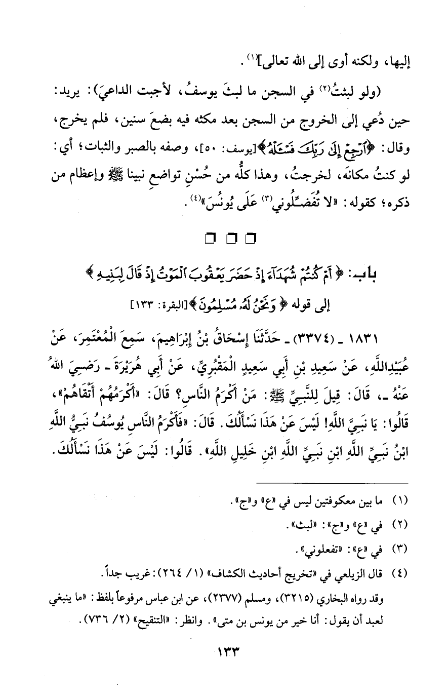 باب: {أَمْ كُنْتُمْ شُهَدَاءَ إِذْ حَضَرَ يَعْقُوبَ الْمَوْتُ إِذْ قَالَ لِبَنِيهِ} إلى قوله {وَنَحْنُ لَهُ مُسْلِمُونَ} [البقرة: 133]