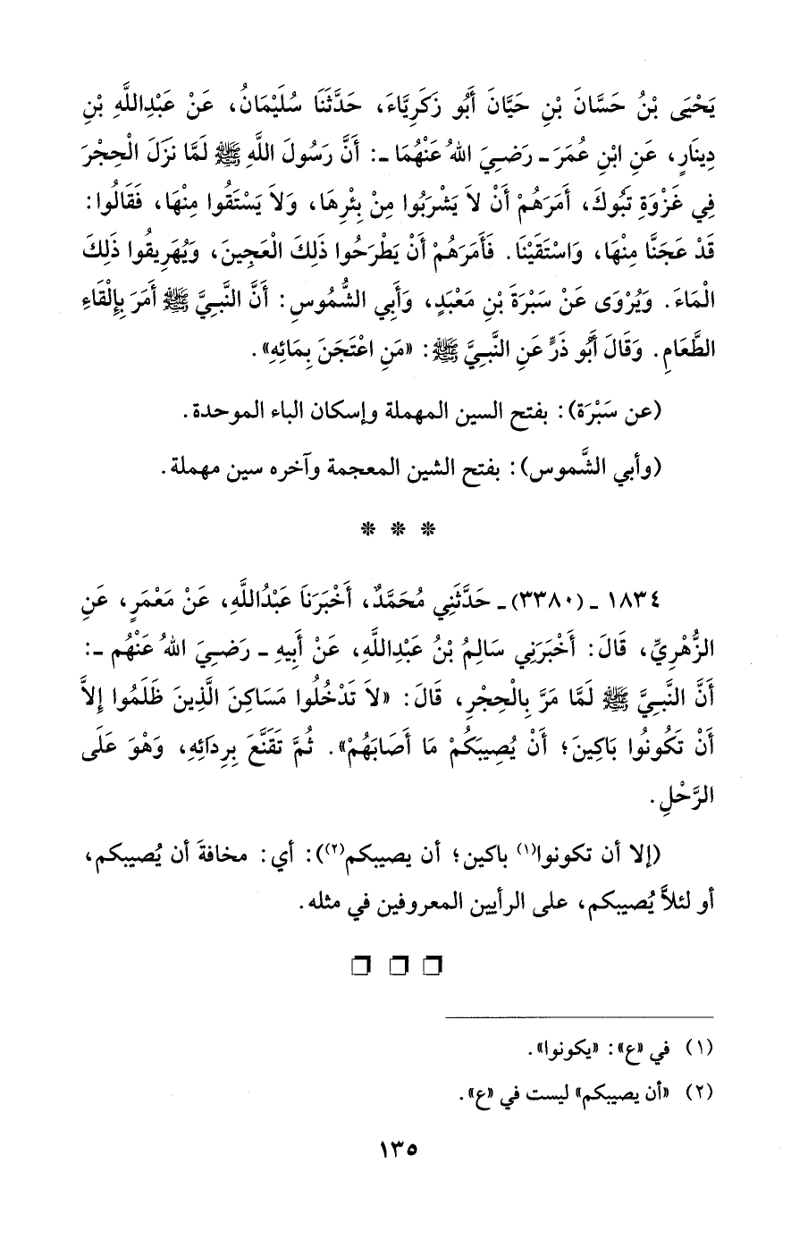 يَحْيىَ بْنُ حَسَّانَ بْنِ حَيَّانَ أَبُو زكرِيَّاءَ، حَدَّثَنَا سُلَيْمَانُ، عَنْ عبْدِ اللَّهِ بْنِ دِينَارٍ، عَنِ ابْنِ عُمَرَ -رَضِيَ اللهُ عَنهُمَا-: أَنَّ رَسُولَ اللَّهِ - صلى الله عليه وسلم - لَمَّا نزلَ الحِجْرَ في غَزْوَةِ تبوكَ، أَمَرَهُمْ أَنْ لَا يَشْربُوا مِنْ بِئْرِهَا، وَلَا يَسْتَقُوا مِنْهَا، فَقَالُوا: قَدْ عَجَنَّا مِنْهَا، وَاسْتَقَيْنَا. فَأَمَرَهُمْ أَنْ يَطْرَحُوا ذَلِكَ الْعَجِينَ، وَيُهَرِيقُوا ذَلِكَ الْمَاءَ. وَيُرْوَى عَنْ سَبْرَةَ بْنِ مَعْبَدٍ، وَأَبِي الشُّمُوسِ: أَنَّ النَّبِيَّ - صلى الله عليه وسلم - أَمَرَ بِإِلْقَاء الطَّعَامِ. وَقَالَ أبو ذَرٍّ عَنِ النَّبِيَّ - صلى الله عليه وسلم -: "مَنِ اعْتَجَنَ بِمَائِهِ".