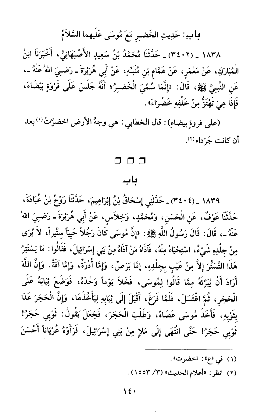 1839 - (3404) - حَدَّثَنِي إِسْحَاقُ بْنُ إِبْراهِيمَ، حَدَّثَنَا رَوْحُ بْنُ عُبَادَةَ، حَدَّثَنَا عَوْفٌ، عَنِ الْحَسَنِ، وَمُحَمَّدٍ، وَخِلَاسٍ، عَنْ أَبِي هُرَيْرَةَ - رضي الله عنه -، قَالَ: قَالَ رَسُولُ اللَّهِ - صلى الله عليه وسلم -: "إِنَّ مُوسَى كَانَ رَجُلًا حَيِيًّا سِتِّيرًا، لَا يُرَى مِنْ جِلْدِهِ شَيْء، اسْتِحْياءً مِنْهُ، فآذَاهُ مَنْ آذَاهُ مِنْ بني إِسْرائِيلَ، فَقَالُوا: مَا يَسْتَترُ هَذَا التَّسَتُّرَ إِلَّا مِنْ عَيْبٍ بِجِلْدِهِ، إِمَّا بَرَص، وَإِمَّا أُدْرَةٌ، وَإِمَّا آفَة. وَإِنَّ اللَّهَ أَرَادَ أَنْ يُبَرِّئَهُ مِمَّا قَالُوا لِمُوسَى، فخلَا يَوْمًا وَحْدَهُ، فَوَضَعَ ثِيَابَهُ عَلَى الْحَجَرِ، ثُمَّ اغْتَسَلَ، فَلَمَّا فَرَغَ، أَقْبَلَ إِلَى ثِيَابِهِ لِيَأْخُذَهَا، وَإِنَّ الْحَجَرَ عَدَا بِثَوْبِهِ، فَأَخَذَ مُوسَى عَصَاهُ، وَطَلَبَ الْحَجَرَ، فَجَعَلَ يَقُولُ: ثَوْبِي حَجَرُ! ثَوْبِي حَجَرُ! حَتى انتهَى إِلَى مَلإِ مِنْ بَنِي إِسْرَائِيلَ، فَرَأَوْهُ عُرْيَانًا أَحْسَنَ