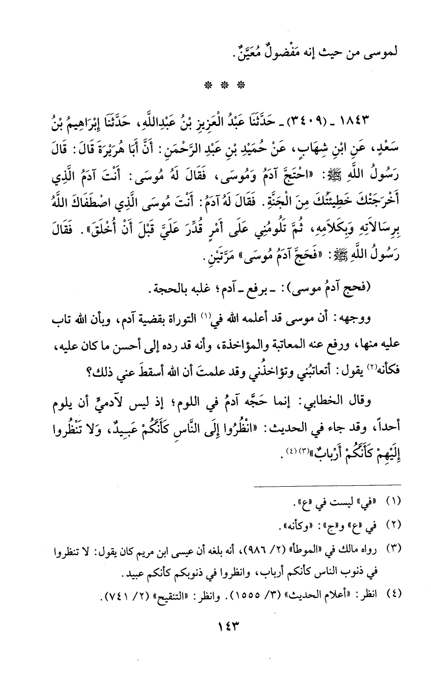 1843 - (3409) - حَدَّثَنَا عَبْدُ الْعَزِيزِ بْنُ عَبْدِ اللَّهِ، حَدَّثَنَا إِبْرَاهِيمُ بْنُ سَعْدٍ، عَنِ ابْنِ شِهَابٍ، عَنْ حُمَيْدِ بْنِ عَبْدِ الرَّحْمَنِ: أَنَّ أَبَا هُرَيْرَةَ قَالَ: قَالَ رسول اللَّهِ - صلى الله عليه وسلم -: "احْتَجَّ آدَمُ وَمُوسىَ، فَقَالَ لَهُ مُوسىَ: أَنْتَ آدَمُ الَّذِي أَخْرجَتْكَ خَطِيئتكَ مِنَ الْجَنَّةِ. فَقَالَ لَهُ آدَمُ: أَنْتَ مُوسىَ الَّذِي اصْطَفَاكَ اللَّهُ بِرِسالَاتِهِ وَبِكَلَامِهِ، ثُمَ تَلُومُنِي علَى أَمْرٍ قُدِّرَ علَي قَبلَ أَنْ أُخلَقَ". فَقَالَ رسولُ اللَّهِ - صلى الله عليه وسلم -: "فَحَجَّ آدَمُ مُوسىَ" مَرَّتَيْنِ.