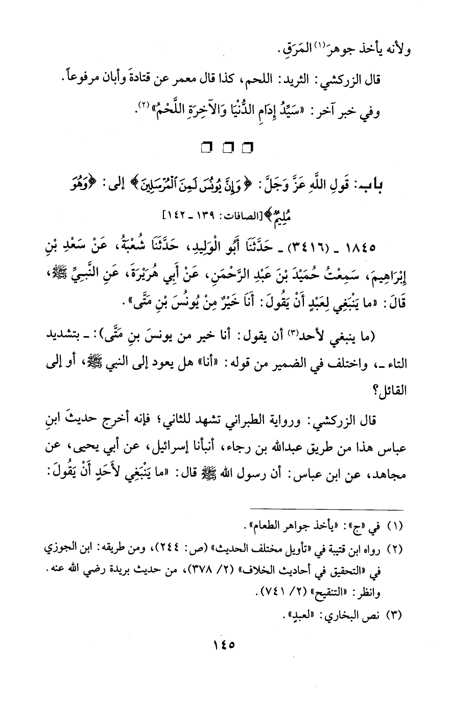 1845 - (3416) - حَدَّثَنَا أَبُو الْوَليدِ، حَدَّثَنَا شُعْبة، عَنْ سَعْدِ بْنِ إِبْرَاهِيمَ، سَمِعْتُ حُمَيْدَ بْنَ عَبْدِ الرَّحْمَنِ، عَنْ أَبِي هُرَيْرَةَ، عَنِ النَّبِيِّ - صلى الله عليه وسلم -، قَالَ: "ما يَنْبَغِي لِعَبْدٍ أَنْ يَقُولَ: أَنَا خَيْرٌ مِنْ يُونُسَ بْنِ مَتَّى".