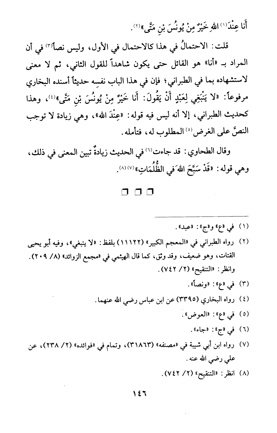 قلت: الاحتمالُ في هذا كالاحتمال في الأول، وليس نصًا (¬3) في أن المراد بـ "أنا" هو القائل حتى يكون شاهدًا للقول الثاني، ثم لا معنى لاستشهاده بما في الطبراني؛ فإن في هذا الباب نفسِه حديثًا أسنده البخاري مرفوعًا: "لا يَنْبَغِي لِعَبْدٍ أَنْ يَقُولَ: أَنا خَيْرٌ مِنْ يُونُس بْنِ مَتى" (¬4)، وهذا كحديث الطبراني، إلا أنه ليس فيه قوله: "عِنْدَ الله"، وهي زيادة لا توجب النصَّ على الغرض (¬5) المطلوب له، فتأمله.