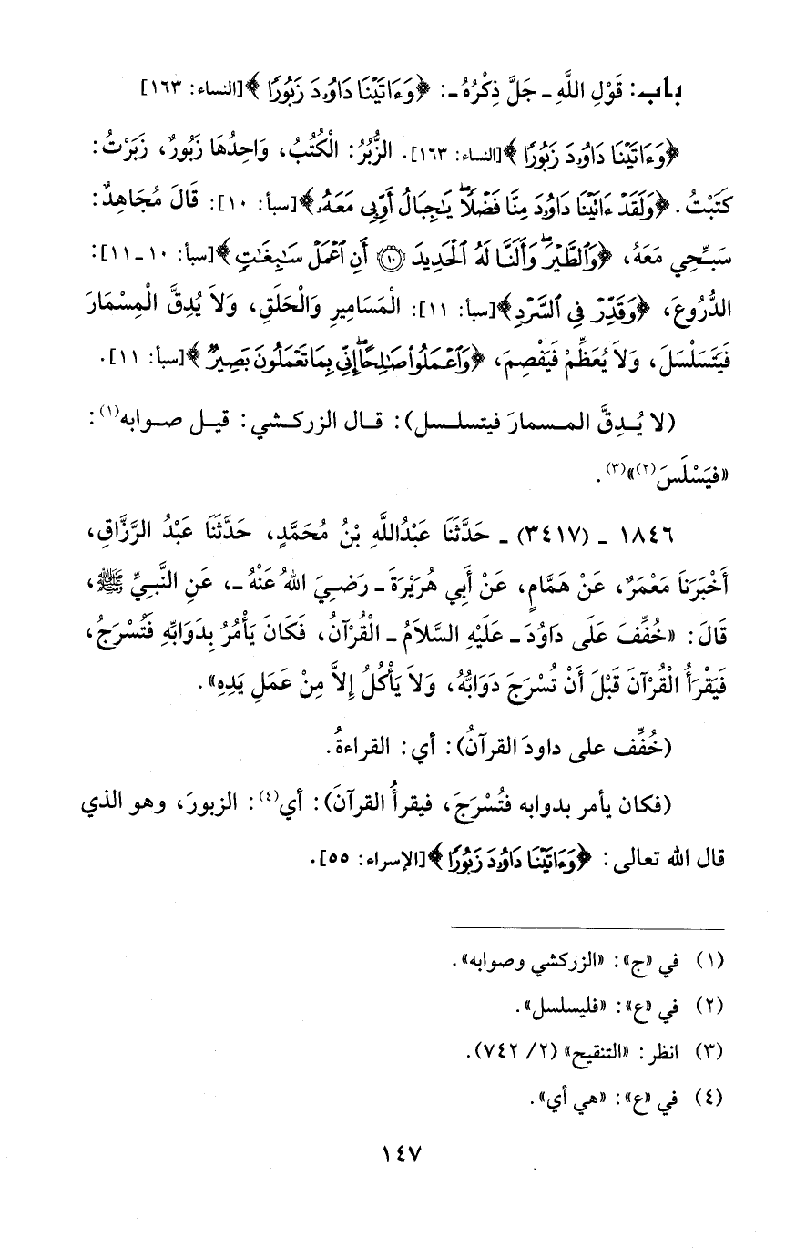 {وَآتَيْنَا دَاوُودَ زَبُورًا} [النساء: 163] الزُّبُرُ: الْكُتُبُ، وَاحِدُهَا زَبُورٌ، زَبَرْتُ: كتبْتُ. {وَلَقَدْ آتَيْنَا دَاوُودَ مِنَّا فَضْلًا يَاجِبَالُ أَوِّبِي مَعَهُ} [سبأ: 10]: قَالَ مُجَاهِد: سَبِّحِي مَعَهُ، {وَالطَّيْرَ وَأَلَنَّا لَهُ الْحَدِيدَ (10) أَنِ اعْمَلْ سَابِغَاتٍ} [سبأ: 10 - 11]: الدُّرُوعَ، {وَقَدِّرْ فِي السَّرْدِ} [سبأ: 11]: الْمَسَامِيرِ وَالْحَلَقِ، وَلَا يُدِقَّ الْمِسْمَارَ فَيتسَلْسَلَ، وَلَا يُعَظِّمْ فَيَفْصِمَ، {وَاعْمَلُوا صَالِحًا إِنِّي بِمَا تَعْمَلُونَ بَصِيرٌ} [سبأ: 11].