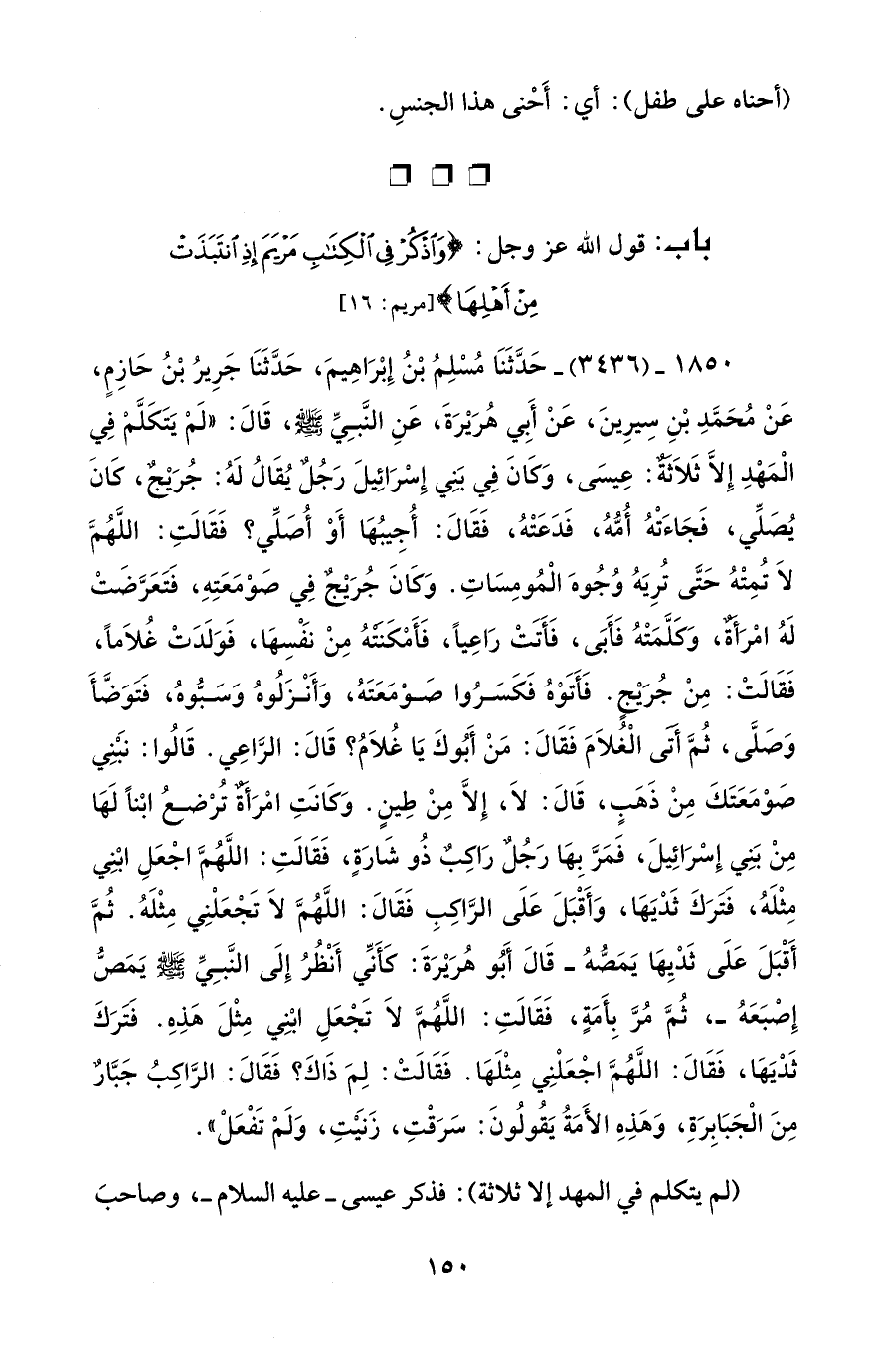 1850 - (3436) - حَدَّثَنَا مُسْلِمُ بْنُ إِبْرَاهِيمَ، حَدَّثَنَا جَرِيرُ بْنُ حَازِمٍ، عَنْ مُحَمَّدِ بْنِ سِيرِينَ، عَنْ أَبي هُرَيْرَةَ، عَنِ النَّبِيِّ - صلى الله عليه وسلم -، قَالَ: "لَمْ يَتَكَلَّمْ فِي الْمَهْدِ إِلَّا ثَلَاثَةٌ: عِيسَى، وَكَانَ فِي بَنِي إِسْرَائِيلَ رَجُلٌ يُقَالُ لَهُ: جُرَيْجٌ، كَانَ يُصَلِّي، فَجَاءَتْهُ أُمُّهُ، فَدَعَتْهُ، فَقَالَ: أُجِيبُهَا أو أُصَلِّي؟ فَقَالَتِ: اللَّهمَّ لَا تُمِتْهُ حَتَّى تُرِيَهُ وُجُوهَ الْمُومِسَاتِ. وَكَانَ جُرَيْجٌ فِي صَوْمَعَتِهِ، فَتَعَرَّضَتْ لَهُ امْرَأة، وَكلَّمَتْهُ فَأَبَى، فَأَتَتْ رَاعِيًا، فَأَمْكَنتهُ مِنْ نفسِهَا، فَوَلَدَتْ غُلَامًا، فَقَالَتْ: مِنْ جُرَيْج. فَأَتَوهُ فَكَسَرُوا صَوْمَعَتَهُ، وَأَنْزَلُوهُ وَسَبُّوهُ، فتوَضَّأَ وَصَلَّى، ثُمَّ أتَى الْغُلَامَ فَقَالَ: مَنْ أَبُوكَ يَا غُلَامُ؟ قَالَ: الرَّاعِي. قَالُوا: نَبْنِي صَوْمَعَتَكَ مِنْ ذَهَبٍ، قَالَ: لَا، إِلَّا مِنْ طِينٍ. وَكَانَتِ امْرَأة تُرْضعُ ابْنًا لَهَا مِنْ بَنِي إِسْرَائِيلَ، فَمَرَّ بِهَا رَجُلٌ رَاكِبٌ ذُو شَارَةٍ، فَقَالَتِ: اللَّهُمَّ اجْعَلِ ابْنِي مِثْلَهُ، فترَكَ ثَدْيَهَا، وَأَقْبَلَ عَلَى الرَّاكبِ فَقَالَ: اللَّهُمَّ لَا تَجْعَلْنِي مِثْلَهُ. ثُمَّ أَقْبَلَ عَلَى ثدْيِهَا يَمَصُّهُ -قَالَ أَبُو هُرَيْرَةَ: كَأَنِّي أَنْظُرُ إِلَى النَّبِيِّ - صلى الله عليه وسلم - يَمَصُّ إِصْبَعَهُ-، ثُمَّ مُرَّ بِأمَةٍ، فَقَالَتِ: اللَّهُمَّ لَا تَجْعَلِ ابْنِي مِثْلَ هَذِهِ. فترَكَ ثَدْيَهَا، فَقَالَ: اللَّهُمَّ اجْعَلْنِي مِثْلَهَا. فَقَالَتْ: لِمَ ذَاكَ؟ فَقَالَ: الرَّاكِبُ جَبَّارٌ مِنَ الْجَبَابِرَةِ، وَهَذِهِ الأَمَةُ يَقُولُونَ: سَرَقْتِ، زَنيتِ، وَلَمْ تَفْعَلْ".