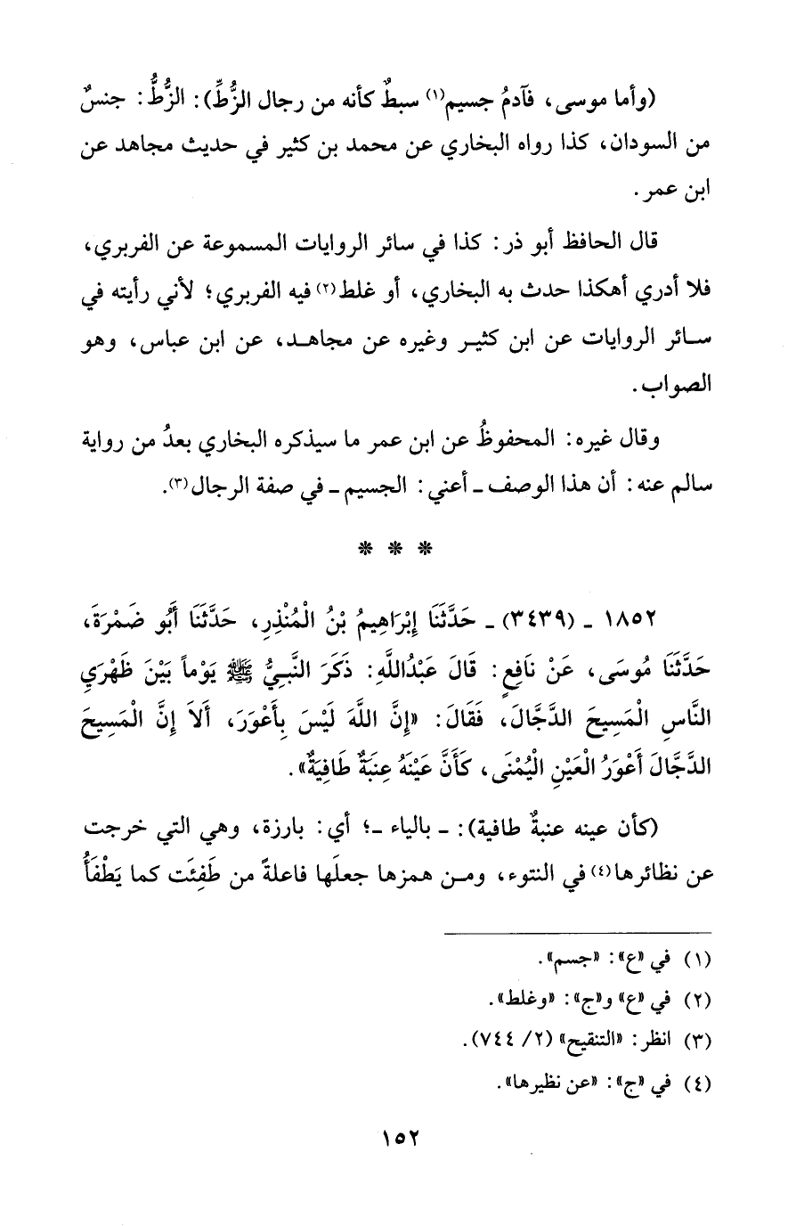 1852 - (3439) - حَدَّثَنَا إِبْرَاهِيمُ بْنُ الْمُنْذِرِ، حَدَّثَنَا أَبُو ضَمْرَةَ، حَدثَنَا مُوسَى، عَنْ نَافِعٍ: قَالَ عَبْدُ اللهِ: ذَكَرَ النَّبِيُّ - صلى الله عليه وسلم - يَوْمًا بَيْنَ ظَهْرَيِ النَّاسِ الْمَسِيحَ الدَّجَّالَ، فَقَالَ: "إِنَّ اللَّهَ لَيْسَ بِأَعْوَرَ، أَلَا إِنَّ الْمَسِيحَ الدَّجَّالَ أَعْوَرُ الْعَيْنِ الْيُمْنَى، كَأَنَّ عَيْنَهُ عِنَبة طَافِيَةٌ".