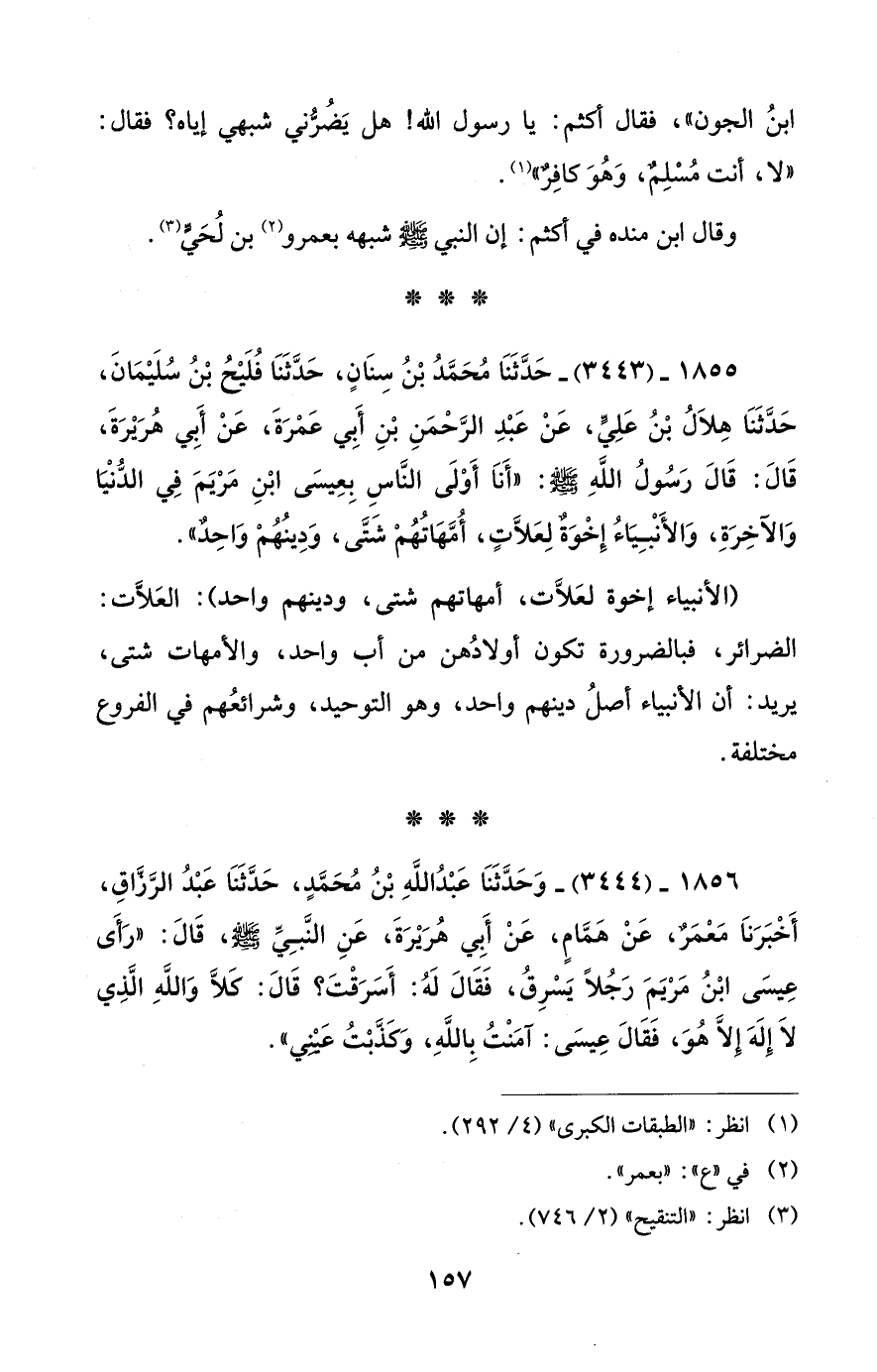 1855 - (3443) - حَدَّثَنَا مُحَمَّدُ بْنُ سِنَانٍ، حَدَّثَنَا فُلَيْحُ بْنُ سُلَيْمَانَ، حَدَّثَنَا هِلَالُ بْنُ عَلِي، عَنْ عَبْدِ الرَّحْمَنِ بْنِ أَبي عَمْرَةَ، عَنْ أَبِي هُرَيْرَةَ، قَالَ: قالَ رَسُولُ اللَّهِ - صلى الله عليه وسلم -: "أَنَا أَوْلَى النَّاسِ بِعِيسَى ابْنِ مَرْيَمَ فِي الدُّنْيَا وَالآخِرَةِ، وَالأَنْبِيَاءُ إِخْوَة لِعَلَّاتٍ، أُمَّهَاتُهُمْ شَتَّى، وَدِينُهُمْ وَاحِد".