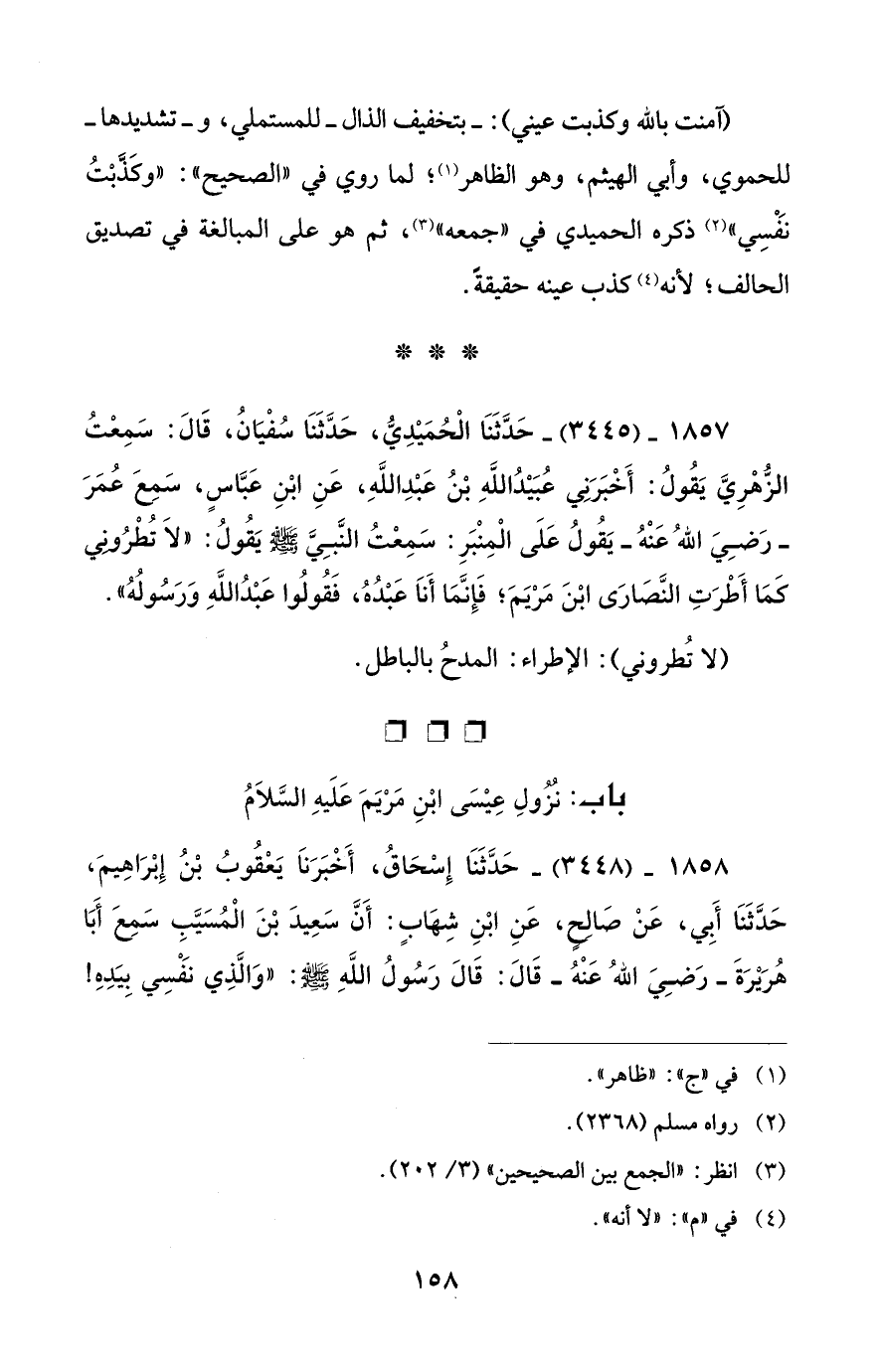 1857 - (3445) - حَدَّثَنَا الْحُمَيْدِيُّ، حَدَّثَنَا سُفْيَانُ، قَالَ: سَمِعْتُ الزُّهْرِيَّ يَقُولُ: أَخْبَرَنِي عُبَيْدُ اللهِ بْنُ عَبْدِ اللَّهِ، عَنِ ابْنِ عَبَّاسٍ، سَمِعَ عُمَرَ - رضي الله عنه - يَقُولُ عَلَى الْمِنْبَرِ: سَمِعْتُ النَّبِي - صلى الله عليه وسلم - يَقُولُ: "لَا تُطْرُوني كَمَا أَطْرَتِ النَّصَارَى ابْنَ مَرْيَمَ؛ فَإِنَّمَا أَنَا عَبدُهُ، فَقُولُوا عَبْدُ اللَّهِ وَرَسُولُهُ".