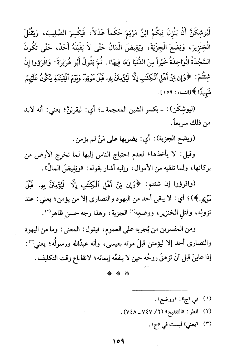 لَيُوشِكنَّ أَنْ يَنزِلَ فِيكُمُ ابْن مَريَمَ حَكَمًا عَدْلًا، فَيَكْسِر الصَّلِيبَ، وَيقْتُلَ الْخِنْزيرَ، وَيَضَعَ الْجزيَةَ، وَيفيض الْمَالُ حَتَى لَا يَقْبَلَهُ أَحَدٌ، حَتَى تَكُونَ السَّجْدَةُ الْوَاحِدَةُ خَيرًا مِنَ الدنيَا وَمَا فِيهَا". ثُمَّ يَقُولُ أَبُو هُريْرَةَ: وَاقْرَؤوا إِنْ شِئتمْ: {وَإِنْ مِنْ أَهْلِ الْكِتَابِ إِلَّا لَيُؤْمِنَنَّ بِهِ قَبْلَ مَوْتِهِ وَيَوْمَ الْقِيَامَةِ يَكُونُ عَلَيْهِمْ شَهِيدًا} [النساء: 159].