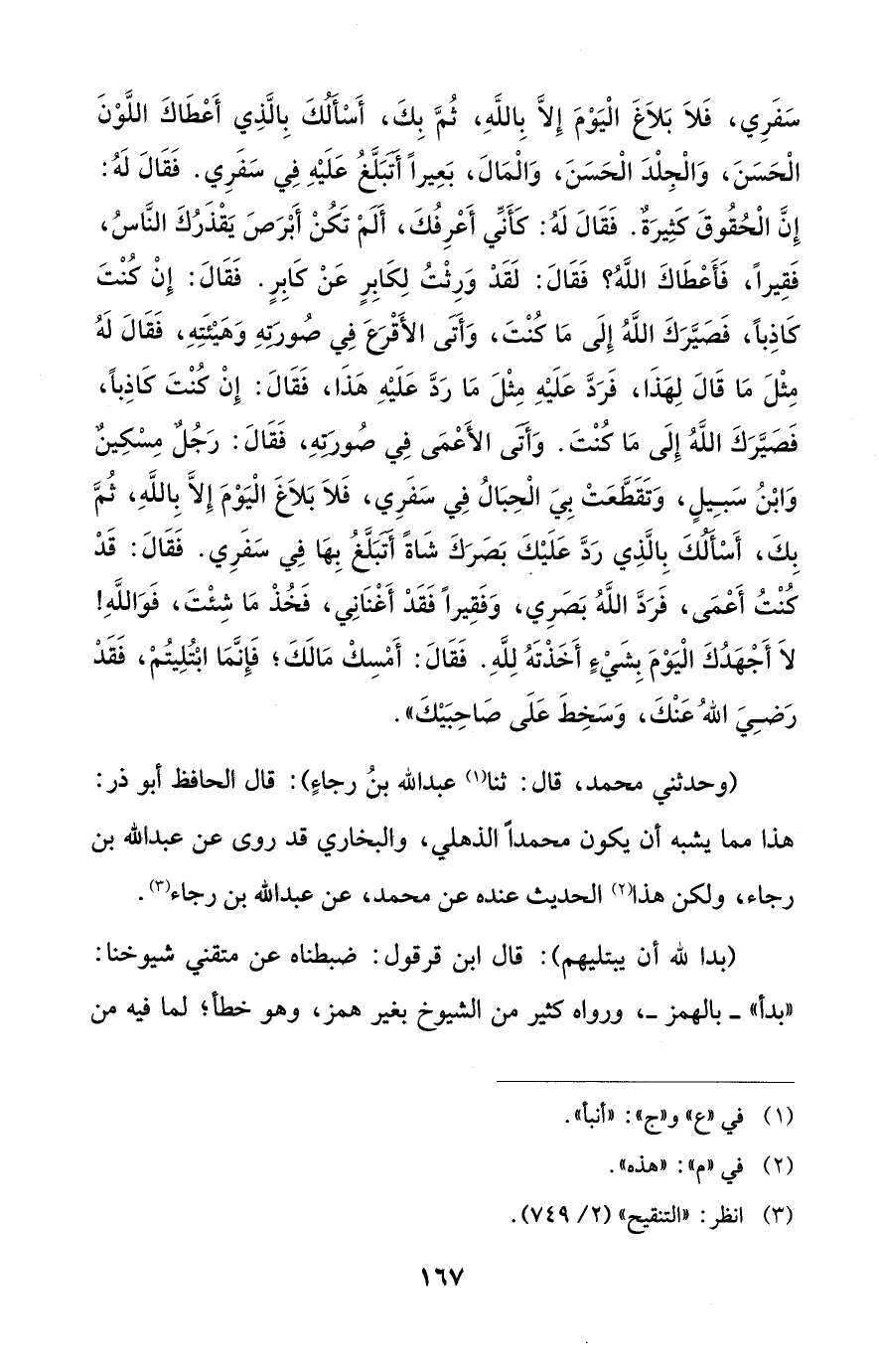 سَفَرِي، فَلَا بَلَاغ الْيَوْمَ إِلَّا بِاللهِ، ثُمَّ بِكَ، أَسأَلُكَ بِالَّذِي أَعْطَاكَ اللَّوْنَ الْحَسَنَ، وَالْجِلْدَ الْحَسَن، وَالْمَالَ، بَعِيرًا أتبَلَّغُ عَلَيْهِ فِي سَفَري. فَقَالَ لَهُ: إِنَّ الْحُقُوقَ كثِيرَة. فَقَالَ لَهُ: كأنِّي أَعْرفك، أَلَمْ تكُن أَبْرَصَ يَقْذَرُكَ النَّاسُ، فَقِيرًا، فَأَعْطَاكَ اللَّهُ؟ فَقَالَ: لَقَدْ وَرِثْتُ لِكَابِرٍ عَنْ كابِرٍ. فَقَالَ: إِنْ كُنْتَ كاذِبًا، فَصَيَّرَكَ اللَّهُ إِلَى مَا كُنْتَ، وَأَتَى الأَقْرَعَ فِي صُورتهِ وَهَيْئَتِهِ، فَقَالَ لَهُ مِثْلَ مَا قَالَ لِهَذَا، فَردَّ عَلَيْهِ مِثْلَ مَا رَدَّ عَلَيْهِ هَذَا، فَقَالَ: إِنْ كُنْتَ كاذِبًا، فَصَيَّرَكَ اللَّهُ إِلَى مَا كُنْتَ. وَأتى الأَعْمَى فِي صُورتهِ، فَقَالَ: رَجُل مِسْكِين وَابْنُ سَبِيلٍ، وَتَقَطَّعَتْ بِيَ الْحِبَالُ فِي سَفَري، فَلَا بَلَاغ الْيَوْمَ إِلَّا بِاللَّهِ، ثُمَّ بِكَ، أَسألكَ بِالَّذِي رَدَّ عَلَيْكَ بَصَرَكَ شاةً أتبَلَّغُ بِهَا فِي سَفَري. فَقَالَ: قَدْ كُنْتُ أَعْمَى، فَردَّ اللَّهُ بَصَرِي، وَفَقِيرًا فَقَدْ أَغْنَانِي، فَخُذْ مَا شِئْتَ، فَوَاللَّهِ! لَا أَجْهَدُكَ الْيَوْمَ بِشَيْءٍ أَخَذْتَهُ لِلَّهِ. فَقَالَ: أَمْسِكْ مَالَكَ؛ فَإِنَّمَا ابْتُلِيتُمْ، فَقَدْ رَضِيَ اللهُ عَنْكَ، وَسَخِطَ عَلَى صَاحِبَيْكَ".