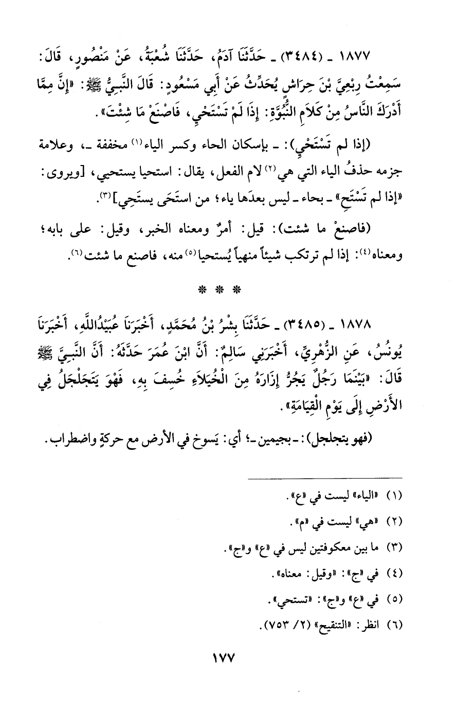 1877 - (3484) - حَدَّثَنَا آدَمُ، حَدَّثَنَا شُعْبةُ، عَنْ مَنْصُورٍ، قَالَ: سَمِعْتُ رِبْعِيَّ بْنَ حِرَاشٍ يُحَدِّثُ عَنْ أَبِي مَسْعُودٍ: قَالَ النَّبِيُّ - صلى الله عليه وسلم -: "إِنَّ مِمَّا أَدْرَكَ النَّاسُ مِنْ كَلَامِ النُبُوَّةِ: إِذَا لَمْ تَسْتَحْيِ، فَاصْنَع مَا شِئْتَ".