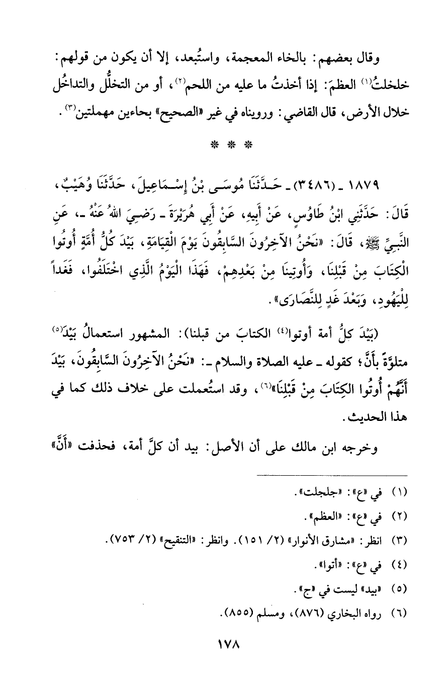 1879 - (3486) - حَدَثنَا مُوسى بْنُ إِسمَاعِيلَ، حَدَثَنَا وُهَيْب، قَالَ: حَدَّثَنِي ابْنُ طَاوُسٍ، عَن أَبِيهِ، عَنْ أَبي هرَيْرَةَ - رضي الله عنه -، عَنِ النَّبِيِّ - صلى الله عليه وسلم -، قَالَ: "نَحْنُ الآخِرونَ السَّابِقُونَ يَوْمَ الْقِيَامَةِ، بَيدَ كُلُّ أُمَّةٍ أُوتوا الْكِتَابَ مِن قَبْلِنَا، وَأُوتِينَا مِنْ بَعْدِهِمْ، فَهَذَا اليوم الَّذِي اختَلَفُوا، فَغَدًا لِلْيَهُودِ، وَبَعْدَ غَدٍ لِلنَّصَارَى".