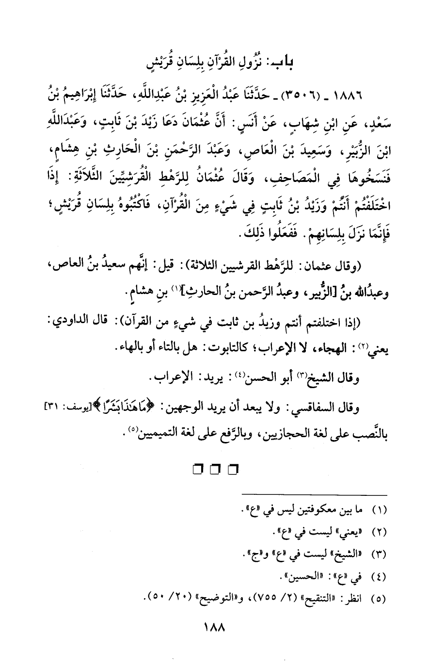 1886 - (3506) - حَدَّثَنَا عَبْدُ الْعَزِيزِ بْنُ عَبْدِ اللَّهِ، حَدَّثَنَا إِبْرَاهِيمُ بْنُ سَعْدٍ، عَنِ ابْنِ شِهَابٍ، عَنْ أَنسٍ: أَنَّ عُثْمَانَ دَعَا زَيْدَ بْنَ ثَابِتٍ، وَعَبْدَ اللَّهِ بْنَ الزُّبَيْرِ، وَسَعِيدَ بْنَ الْعَاصِ، وَعَبْدَ الرحْمَنِ بْنَ الْحَارِثِ بْنِ هِشَامٍ، فَنَسَخُوهَا فِي الْمَصَاحِفِ، وَقَالَ عُثْمَانُ لِلرَّهْطِ الْقُرَشِيِّينَ الثَّلَاثَةِ: إِذَا اخْتَلَفْتُمْ أَنتمْ وَزيدُ بْنُ ثَابِتٍ فِي شَيْءٍ مِنَ الْقُرْآنِ، فَاكْتبوهُ بِلِسَانِ قُرَيْشٍ؛ فَإِنَّمَا نزَلَ بِلِسَانِهِمْ. فَفَعَلُوا ذَلِكَ.