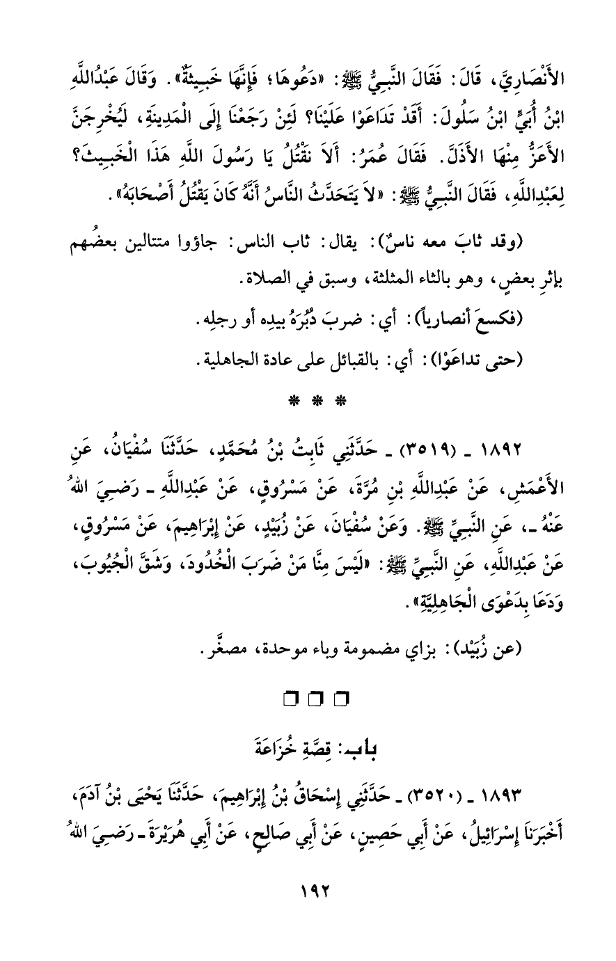 1892 - (3519) - حَدَّثَنِي ثَابِتُ بْنُ مُحَمدٍ، حَدَّثَنَا سُفْيَانُ، عَنِ الأَعْمَشِ، عَنْ عَبْدِ اللَّهِ بْنِ مُرَّةَ، عَنْ مَسْرُوقٍ، عَنْ عَبْدِ اللَّهِ - رضي الله عنه -، عَنِ النَّبِيِّ - صلى الله عليه وسلم -. وَعَنْ سُفْيانَ، عَنْ زُبَيْدٍ، عَنْ إِبْرَاهِيمَ، عَنْ مَسْرُوقٍ، عَنْ عَبْدِ اللَّهِ، عَنِ النَّبِيِّ - صلى الله عليه وسلم -: "لَيْسَ مِنَّا مَنْ ضَرَبَ الْخُدُودَ، وَشَقَّ الْجُيُوبَ، وَدَعَا بِدَعْوَى الْجَاهِلِيَّة".