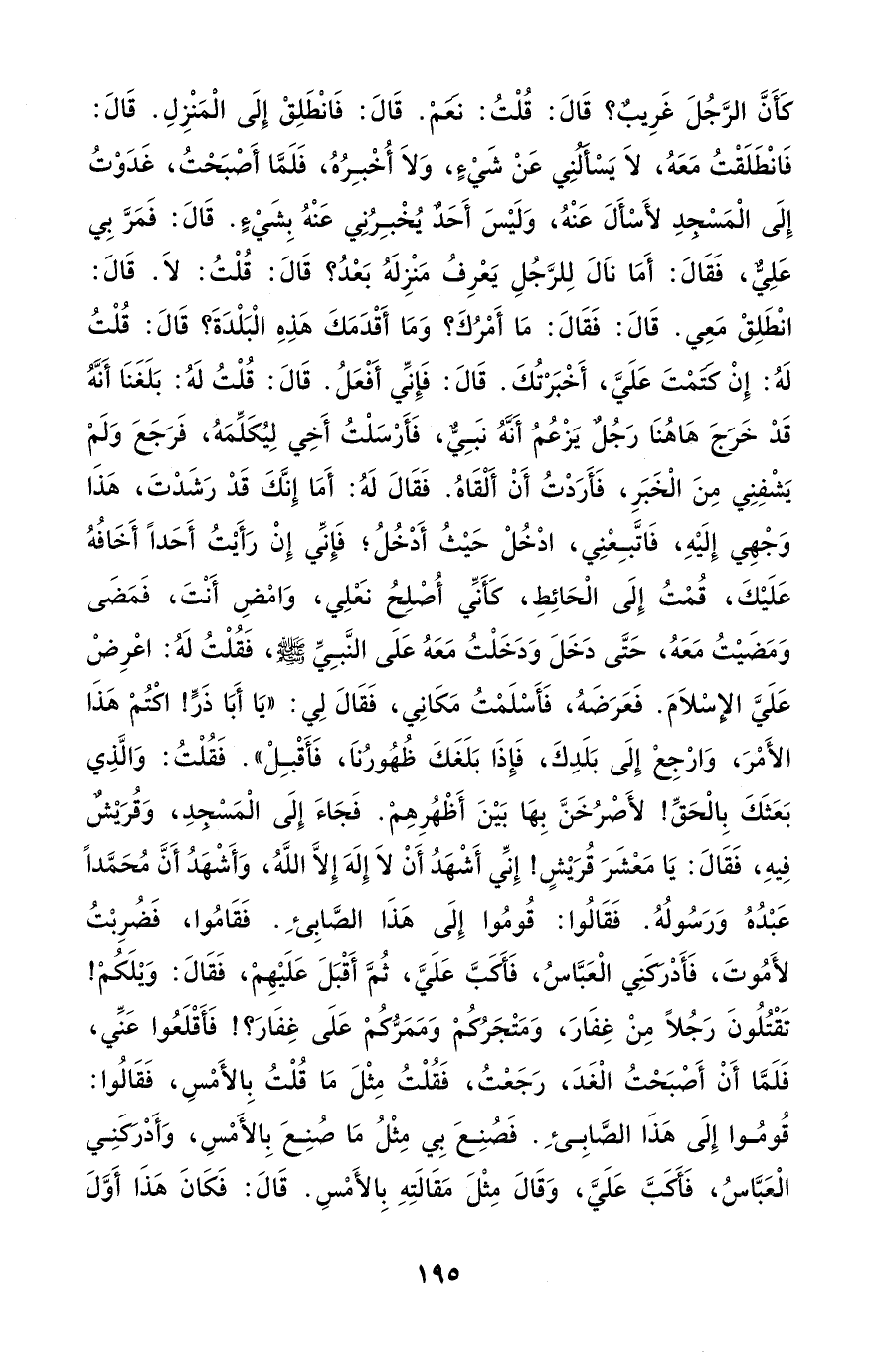كَأَنَّ الرَّجُلَ غَرِيبٌ؟ قَالَ: قُلْتُ: نعمْ. قَالَ: فَانْطَلِقْ إِلَى الْمَنْزِلِ. قَالَ: فَانْطَلَقْتُ مَعَهُ، لَا يَسْألنِي عَنْ شَيْءٍ، وَلَا أخبِرُهُ، فَلَمَّا أَصْبَحْتُ، غَدَوْتُ إِلَى الْمَسْجدِ لأَسْأَلَ عَنْهُ، وَلَيْسَ أَحَدٌ يُخْبِرُنِي عَنْهُ بِشَيْءٍ. قَالَ: فَمَرَّ بِي عَلِيٌّ، فَقَالَ: أَمَا نَالَ لِلرَّجُلِ يَعْرفُ مَنْزِلَهُ بعْدُ؟ قَالَ: قُلْتُ: لَا. قَالَ: انْطَلِقْ مَعِي. قَالَ: فَقَالَ: مَا أَمْرُكَ؟ وَمَا أَقْدَمَكَ هَذِهِ الْبَلْدَةَ؟ قَالَ: قُلْتُ لَهُ: إِنْ كتمْتَ عَلَيَّ، أَخْبَرْتُكَ. قَالَ: فَإِنِّي أَفْعَلُ. قَالَ: قُلْتُ لَهُ: بَلَغَنَا أَنَّهُ قَدْ خَرَجَ هَاهُنَا رَجُلٌ يَزْعُمُ أَنَّهُ نبِيٌّ، فَأَرْسَلْتُ أَخِي لِيُكَلِّمَهُ، فَرجَعَ وَلَمْ يَشفِنِي مِن الْخَبَرِ، فَأَرَدْتُ أَنْ أَلْقَاهُ. فَقَالَ لَهُ: أَمَا إِنَّكَ قَدْ رَشَدْتَ، هَذَا وَجْهِي إِلَيْهِ، فَاتَّيِعْنِي، ادْخُلْ حَيْثُ أَدْخُلُ؛ فَإِنِّي إِن رَأَيْتُ أَحَدًا أَخَاُفهُ عَلَيكَ، قُمْتُ إِلَى الْحَائِطِ، كأَني أصلِحُ نَعلِي، وَامضِ أَنتَ، فَمَضَى وَمَضَيْتُ مَعَهُ، حَتَّى دَخَلَ وَدَخَلْتُ مَعَهُ عَلَى النَّبِيِّ - صلى الله عليه وسلم -، فَقُلْتُ لَهُ: اعْرِضْ عَلَيَّ الإسْلَامَ. فَعَرَضَهُ، فَأَسْلَمْتُ مَكَانِي، فَقَالَ لِي: "يَا أَبَا ذَرٍّ! اكتُمْ هَذَا الأَمْرَ، وَارْجِعْ إِلَى بَلَدِكَ، فَإِذَا بَلَغَكَ ظُهورُنَا، فَأَقْبِلْ". فَقُلتُ: وَالذِي بَعَثَكَ بِالْحَقِّ! لأَصْرخَن بِهَا بَيْنَ أَظْهُرِهِمْ. فَجَاءَ إِلَى الْمَسْجدِ، وَقُريْش فِيهِ، فَقَالَ: يَا مَعْشَرَ قُريش إِنَي أَشْهَدُ أَنْ لَا إِلَهَ إِلَا اللَهُ، وَأَشْهَدُ أَنَ مُحَمَدًا عَبْدُهُ وَرَسُولُهُ. فَقَالُوا: قُومُوا إِلَى هَذَا الصَّابِئ. فَقَامُوا، فَضُرِبْتُ لأَمُوتَ، فَأَدْركنِي الْعَبَّاسُ، فَأكبَّ عَلَيَّ، ثُمَّ أَقْبَلَ عَلَيْهِمْ، فَقَالَ: وَيْلَكُمْ! تَقْتُلُونَ رَجُلًا مِن غِفَارَ، وَمَتْجَرُكُمْ وَمَمَرُّكُمْ عَلَى غِفَارَ؟! فَأَقْلَعُوا عَنِّي، فَلَمَّا أَنْ أَصْبَحْتُ الْغَدَ، رَجَعْتُ، فَقُلْتُ مِثْلَ مَا قُلْتُ بِالأَمْسِ، فَقَالُوا: قُومُوا إِلَى هَذَا الصَّابِئ. فَصُنِعَ بِي مِثْلُ مَا صُنِعَ بِالأَمْسِ، وَأَدْركنِي الْعَبَّاسُ، فَأكبَّ عَلَيَّ، وَقَالَ مِثْلَ مَقَالَتِهِ بِالأَمْسِ. قَالَ: فَكَانَ هَذَا أَوَّلَ
