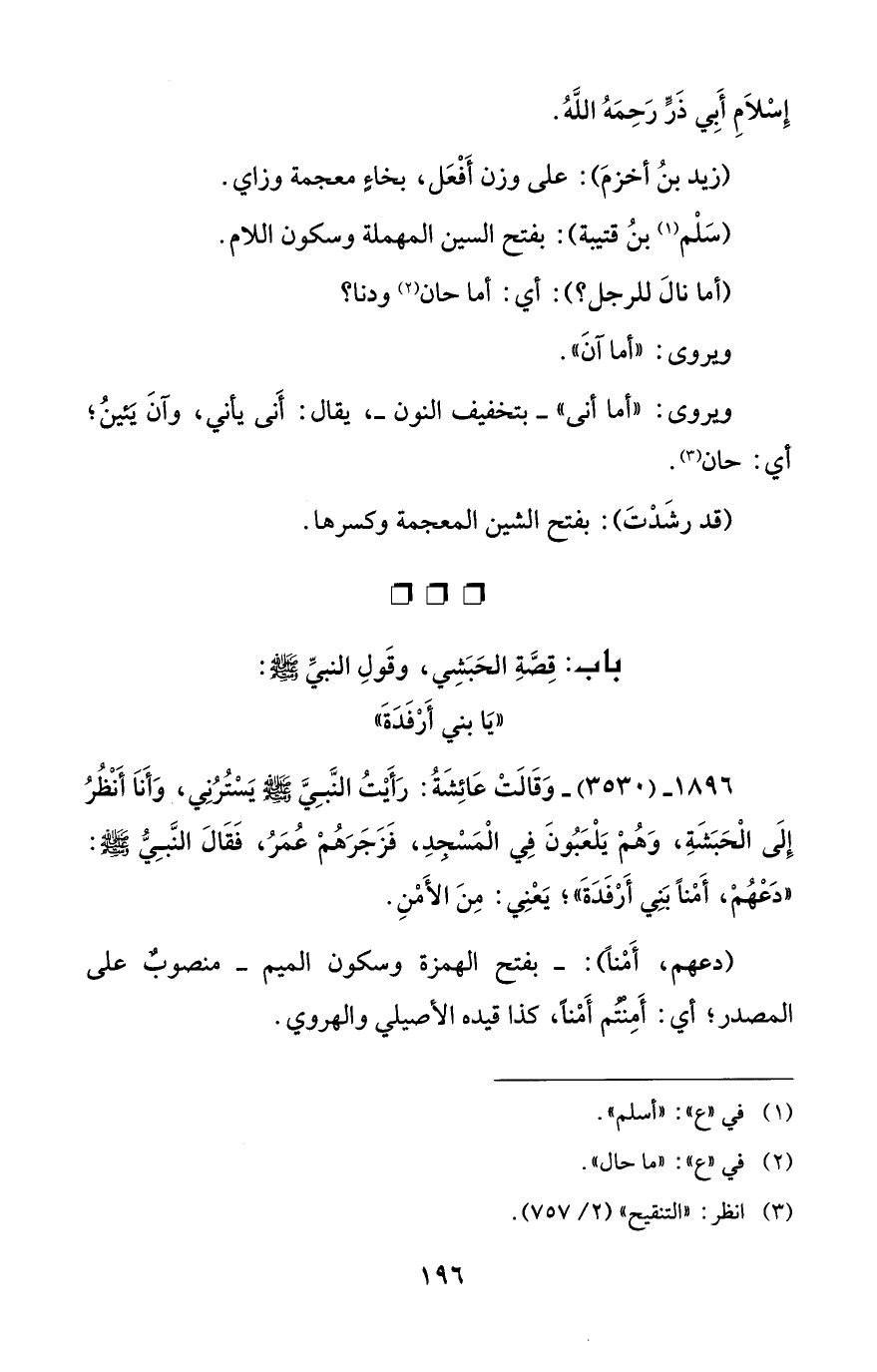 1896 - (3530) - وَقَالَتْ عَائِشَةُ: رَأَيْتُ النَّبِيَّ - صلى الله عليه وسلم - يَسْتُرُنِي، وَأَنَا أَنْظُرُ إِلَى الْحَبَشَةِ، وَهُمْ يَلْعَبُونَ فِي الْمَسْجدِ، فَزَجَرَهُمْ عُمَرُ، فَقَالَ النَّبِيُّ - صلى الله عليه وسلم -: "دَعْهُمْ، أَمْنًا بَنِي أَرْفَدَةَ"؛ يَعْنِي: مِنَ الأَمْنِ.