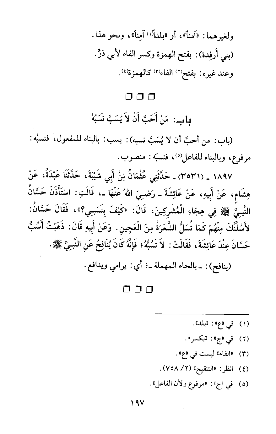 1897 - (3531) - حَدَّثَنِي عُثْمَانُ بْنُ أَبِي شيبة، حَدَّثَنَا عَبْدَةُ، عَنْ هِشَامٍ، عَنْ أَبِيهِ، عَنْ عَائِشَةَ -رَضِيَ اللهُ عَنْهَا-، قَالَتِ: اسْتَأْذَنَ حَسَّانُ النَّبِيَّ - صلى الله عليه وسلم - فِي هِجَاءِ الْمُشْرِكينَ، قَالَ: "كيْفَ بِنَسَبِي؟ "، فَقَالَ حَسَّانُ: لأَسُلَّنَّكَ مِنْهُمْ كَمَا تُسَلُّ الشَّعَرَةُ مِنَ الْعَجينِ. وَعَنْ أَبِيهِ قَالَ: ذَهَبْتُ أَسُبُّ حَسَّانَ عِنْدَ عَائِشَةَ، فَقَالَتْ: لَا تَسُبُّهُ؛ فَإِنَّهُ كَانَ يُنَافح عَنِ النَّبِيِّ - صلى الله عليه وسلم -.