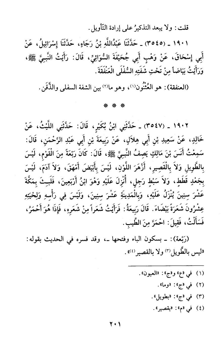 1901 - (3545) - حَدَّثَنَا عَبْدُ اللَّهِ بْنُ رَجَاءِ، حَدَّثَنَا إِسْرَائِيلُ، عَنْ أَبي إِسْحَاقَ، عَنْ وَهْبٍ أَبِي جُحَيْفَةَ السُّوَائِيِّ، قَالَ: رَأَيْتُ النَّبِيَّ - صلى الله عليه وسلم -، وَرَأَيْتُ بَيَاضًا مِنْ تَحْتِ شَفَتِهِ السُّفْلَى الْعَنْفَقَةَ.