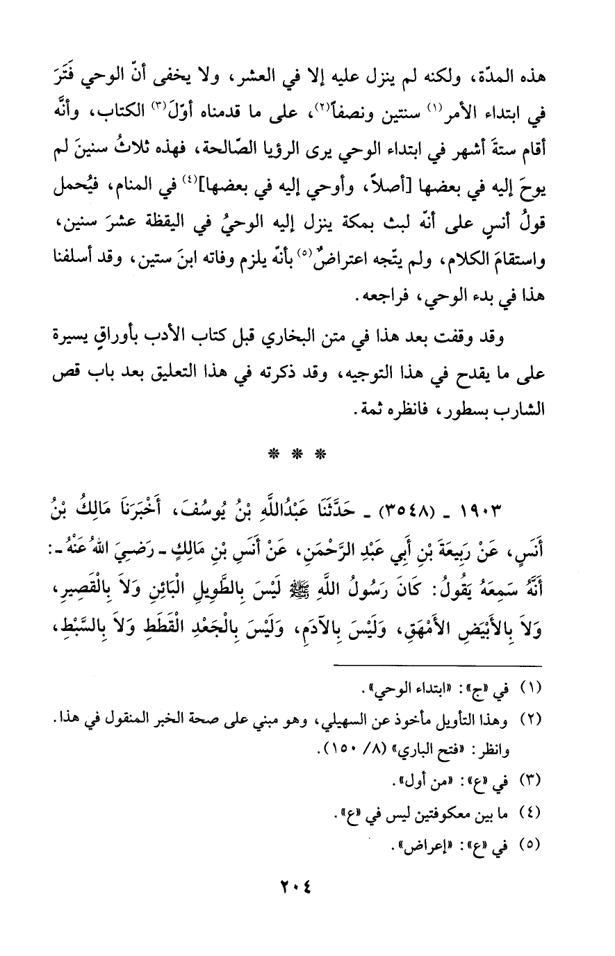 1903 - (3548) - حَدَّثَنَا عَبْدُ اللَّهِ بْنُ يُوسُفَ، أَخْبَرَنَا مَالِكُ بْنُ أَنس، عَنْ رَبِيعَةَ بْنِ أَبِي عَبْدِ الرَّحْمَنِ، عَنْ أَنسِ بْنِ مَالِكٍ - رضي الله عنه -: أَنهُ سَمِعَهُ يَقُولُ: كانَ رَسُولُ اللَّهِ - صلى الله عليه وسلم - لَيْسَ بِالطَّوِيلِ الْبَائِنِ وَلَا بِالْقَصِيرِ، وَلَا بِالأَبْيَضِ الأَمْهَقِ، وَلَيْسَ بِالآدَمِ، وَلَيْسَ بِالْجَعْدِ الْقَطَطِ وَلَا بِالسَّبْطِ،