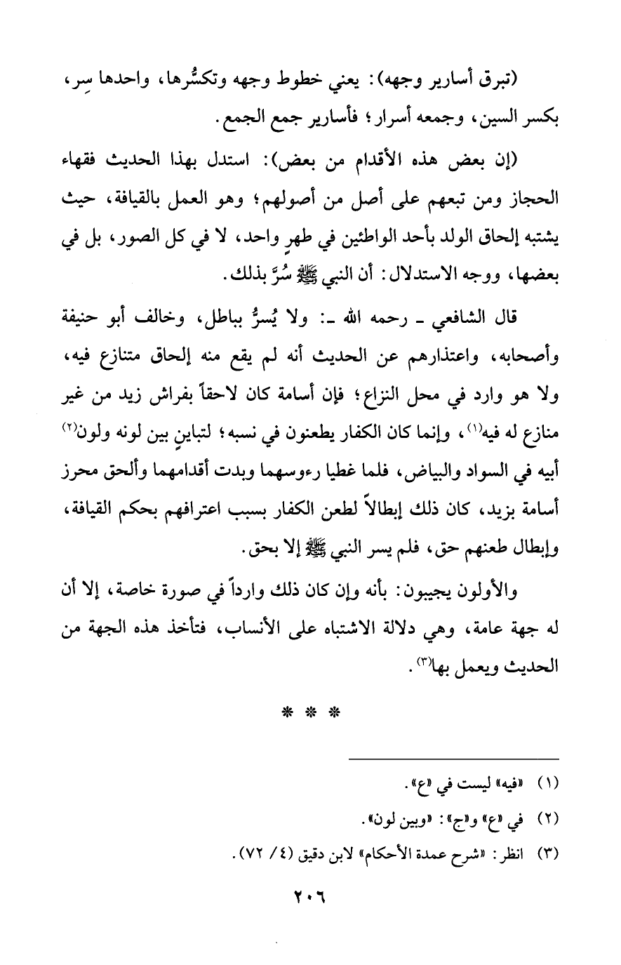 قال الشافعي -رحمه الله-: ولا يُسرُّ بباطل، وخالف أبو حنيفة وأصحابه، واعتذارهم عن الحديث أنه لم يقع منه إلحاق متنازع فيه، ولا هو وارد في محل النزاع؛ فإن أسامة كان لاحقًا بفراش زيد من غير منازع له فيه (¬1)، وإنما كان الكفار يطعنون في نسبه؛ لتباينٍ بين لونه ولون (¬2) أبيه في السواد والبياض، فلما غطيا رءوسهما وبدت أقدامهما وألحق محرز أسامة بزيد، كان ذلك إبطالًا لطعن الكفار بسبب اعترافهم بحكم القيافة، وإبطال طعنهم حق، فلم يسر النبي - صلى الله عليه وسلم - إلا بحق.