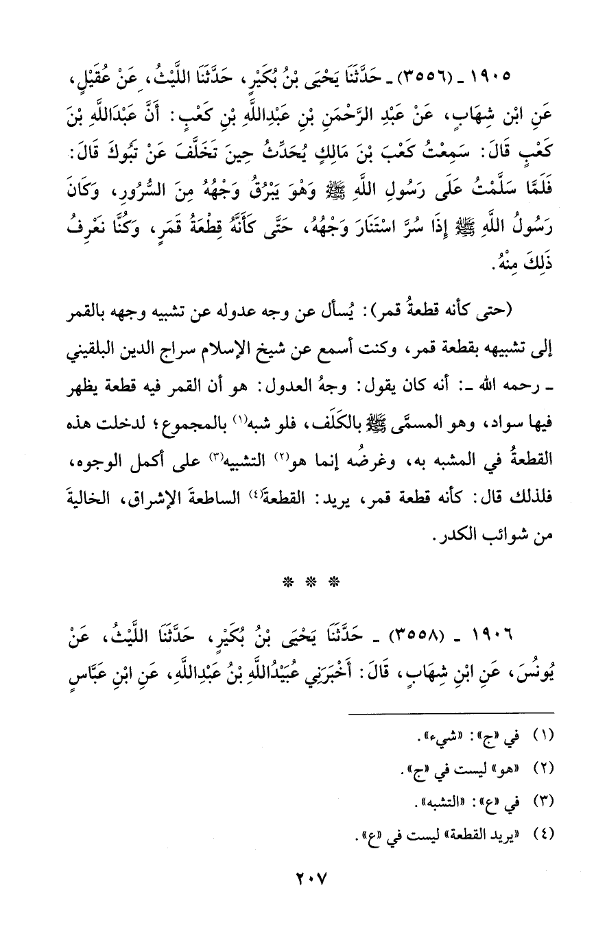 1905 - (3556) - حَدَّثَنَا يَحْيى بْنُ بُكَيْر، حَدَّثَنَا اللَّيْثُ، عَنْ عُقَيْلٍ، عَنِ ابْن شهَابٍ، عَنْ عَبْدِ الرَّحْمَنِ بْنِ عَبْدِ اللَّهِ بْنِ كعْبٍ: أَن عَبْدَ اللَّهِ بْنَ كَعْبٍ قَالَ: سَمِعْتُ كَعْبَ بْنَ مَالِكٍ يُحَدِّثُ حِينَ تَخَلَّفَ عَنْ تَبُوكَ قَالَ: فَلَمَّا سَلَّمْتُ عَلَى رَسُولِ اللَّهِ - صلى الله عليه وسلم - وَهْوَ يَبْرُقُ وَجْهُهُ مِنَ السُّرُورِ، وَكانَ رَسُولُ اللَّهِ - صلى الله عليه وسلم - إِذَا سُرَّ اسْتَنَارَ وَجْهُهُ، حَتَّى كأنه قِطعَةُ قَمَرٍ، وَكنَّا نَعْرِفُ ذَلِكَ مِنْهُ.