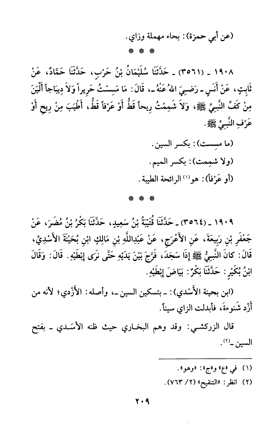 1908 - (3561) - حَدَّثَنَا سُلَيْمَانُ بْنُ حَرْبٍ، حَدَّثَنَا حَمَّاد، عَنْ ثَابِتٍ، عَنْ أَنسٍ - رضي الله عنه -، قَالَ: مَا مَسِسْتُ حَرِيرًا وَلَا دِيبَاجًا أليَنَ مِنْ كَفِّ النَّبِيِّ - صلى الله عليه وسلم -، وَلَا شَمِمْتُ رِيحًا قَطُّ أَوْ عَرْفًا قَطُّ، أَطْيَبَ مِنْ رِيح أَوْ عَرْفِ النَّبِيِّ - صلى الله عليه وسلم -.