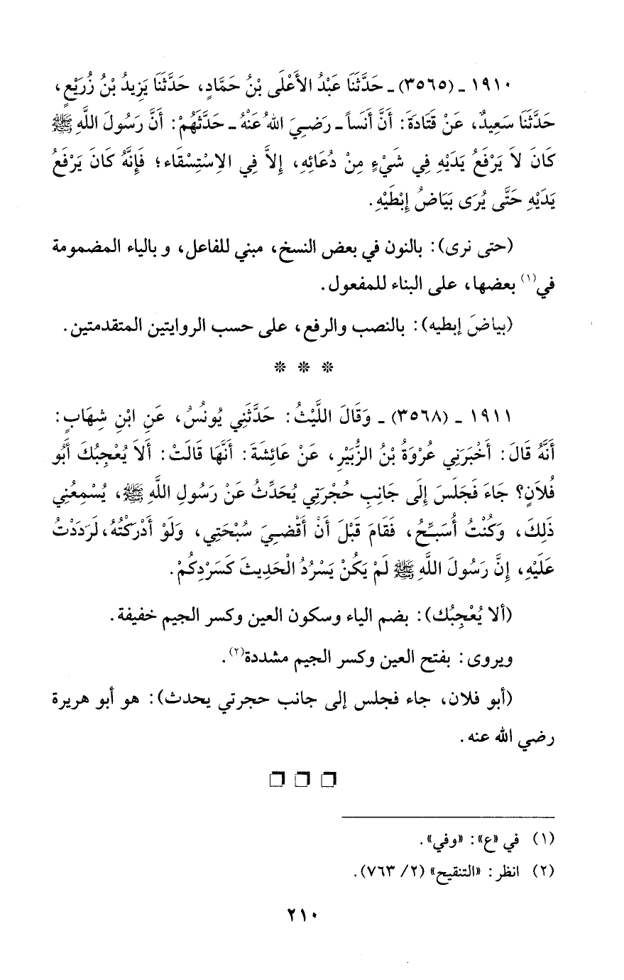 1911 - (3568) - وَقَالَ اللَّيْث: حَدَّثَنِي يُونس، عن ابْن شهَاب: أَنهُ قَالَ: أَخبَرَنِي عُرْوَةُ بْن الزبَيْرِ، عَن عَائِشةَ: أَنَّها قَالت: أَلَا يعجِبُكَ أبو فُلَانٍ؟ جَاءَ فَجَلَس إِلَى جَانِبِ حُجْرتِي يُحَدِّث عَن رَسُولِ اللهِ - صلى الله عليه وسلم - يُسمِعُنِي ذَلِكَ، وَكنتُ أُسَبِّحُ، فَقَامَ قَبْلَ أَن أَقضي سبحتي، وَلَوْ أَدْركْتُهُ، لَرددت عَلَيهِ، إِن رسُولَ اللَّهِ - صلى الله عليه وسلم - لم يَكن يَسرد الْحَدِيثَ كَسَردكم.