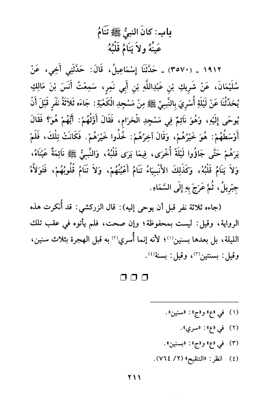 1912 - (3570) - حَدَّثَنَا إِسْمَاعيلُ، قَالَ: حَدَّثَنِي أَخِي، عَنْ سُلَيْمَانَ، عَنْ شَريكِ بْنِ عَبْدِ اللَّهِ بْنِ أَبِي نَمِر، سَمِعْتُ أَنس بْنَ مَالِكٍ يُحَدِّثُنَا عَنْ لَيْلَةِ أُسْريَ بِالنَّبِيِّ - صلى الله عليه وسلم - مِنْ مَسْجِدِ الْكَعْبة: جَاءَه ثَلَاثَةُ نَفَر قَبْلَ أَنْ يُوحَى إِلَيْهِ، وَهُوَ نَائِم فِي مَسْجدِ الْحَرَامِ، فَقَالَ أَوَّلُهُمْ: أيهُمْ هُوَ؟ فَقَالَ أَوْسَطُهُمْ: هُوَ خَيْرُهُمْ، وَقَالَ آخِرُهُمْ: خُذُوا خَيْرَهُمْ. فَكَانَتْ تِلْكَ، فَلَمْ يَرَهُمْ حَتَّى جَاؤُوا لَيْلَةً أُخْرَى، فِيمَا يَرَى قَلْبُهُ، وَالنَّبِيُّ - صلى الله عليه وسلم - نَائِمَة عَينَاهُ، وَلَا يَنَامُ قَلْبُهُ، وَكَذَلِكَ الأَنْبِيَاءُ تَنَامُ أَعْيُنُهُمْ، وَلَا تَنَامُ قُلُوبُهُمْ، فتوَلَاهُ جِبْرِيلُ، ثُمَّ عَرَجَ بِهِ إِلَى السَّمَاءَ.
