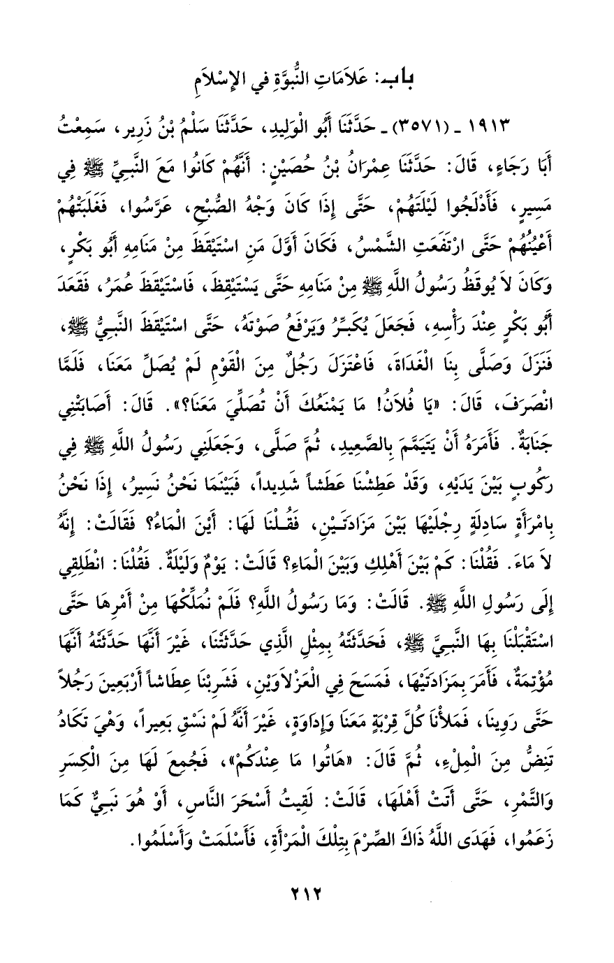 1913 - (3571) - حَدَّثَنَا أَبُو الْوَليدِ، حَدَّثَنَا سَلْمُ بْنُ زَرِير، سَمِعْتُ أَبَا رَجَاءٍ، قَالَ: حَدَّثَنَا عِمْرَانُ بْنُ حُصَيْنٍ: أَنَّهُمْ كَانُوا مَعَ النَّبِيِّ - صلى الله عليه وسلم - فِي مَسِيرٍ، فَأَدْلَجُوا لَيْلَتَهُمْ، حَتَّى إِذَا كَانَ وَجْهُ الصُّبْح، عَرَّسُوا، فَغَلَبَتْهُمْ أَعْيُنُهُمْ حَتَّى ارْتَفَعَتِ الشَّمْسُ، فَكَانَ أَوَّلَ مَنِ اسْتَيْقَظَ مِنْ مَنَامِهِ أَبُو بَكْرٍ، وَكَانَ لَا يُوقَظُ رَسُولُ اللَّهِ - صلى الله عليه وسلم - مِنْ مَنَامِهِ حَتَّى يَسْتَيْقِظَ، فَاسْتَيْقَظَ عُمَرُ، فَقَعَدَ أبَو بَكْرٍ عِنْدَ رَأْسِهِ، فَجَعَلَ يُكَبِّرُ وَيَرْفَعُ صَوْتَهُ، حَتَّى اسْتَيْقَظَ النَّبِيُّ - صلى الله عليه وسلم -، فَنَزَلَ وَصَلَّى بِنَا الْغَدَاةَ، فَاعْتَزَلَ رَجُلٌ مِنَ الْقوْمِ لَمْ يُصَلِّ مَعَنَا، فَلَمَّا انْصَرَفَ، قالَ: "يَا فُلَانُ! مَا يَمنَعُكَ أَنْ تُصَلِّيَ مَعَنَا؟ ". قَالَ: أَصَابتنِي جَنَابَةٌ. فَأَمَرَهُ أَنْ يَتَيَمَّمَ بِالصَّعِيدِ، ثُمَّ صَلَّى، وَجَعَلَنِي رَسُولُ اللَّهِ - صلى الله عليه وسلم - في ركُوبٍ بَيْنَ يَدَيْهِ، وَقَدْ عَطِشْنَا عَطَشًا شَدِيدًا، فَبَيْنَمَا نَحْنُ نسِيرُ، إِذَا نحنُ بِامْرَأَةٍ سَادِلَةٍ رِجْلَيْهَا بَيْنَ مَزَادَتَيْنِ، فَقُلْنَا لَهَا: أَيْنَ الْمَاءُ؟ فَقَالَتْ: إِنَّهُ لَا مَاءَ. فَقُلْنَا: كَمْ بَيْنَ أَهْلِكِ وَبَيْنَ الْمَاءِ؟ قَالَتْ: يَوْم وَلَيْلَة. فَقُلْنَا: انْطَلِقِي إِلَى رَسُولِ اللَّهِ - صلى الله عليه وسلم -. قَالَتْ: وَمَا رَسُولُ اللَّهِ؟ فَلَمْ نُمَلِّكْهَا مِنْ أَمْرِهَا حَتَّى اسْتَقْبَلْنَا بِهَا النَّبِيَّ - صلى الله عليه وسلم -، فَحَدَّثتهُ بِمِثْلِ الَّذِي حَدَّثتنَا، غَيْرَ أَنَّهَا حَدَّثتهُ أَنَّهَا مُؤْتمَة، فَأمَرَ بِمَزَادَتَيْهَا، فَمَسَحَ فِي الْعَزْلَاوَيْنِ، فَشَرِبْنَا عِطَاشًا أَرْبَعِينَ رَجُلًا حَتَّى رَوِينَا، فَمَلأْنَا كُلَّ قِرْبَةٍ مَعَنَا وَإِداوَةٍ، غَيْرَ أَنَّهُ لَمْ نسقِ بَعِيرًا، وَهْيَ تَكَادُ تَنِضُّ مِنَ الْمِاءِ، ثمَّ قَالَ: "هَاتُوا مَا عِنْدكمْ"، فَجُمِعَ لَهَا مِنَ الْكِسَرِ وَالتَّمْرِ، حَتَّى أتتْ أَهْلَهَا، قَالَتْ: لَقِيتُ أَسْحَرَ النَّاسِ، أَوْ هُوَ نبَيٌّ كَمَا زَعَمُوا، فَهَدَى اللَّهُ ذَاكَ الصِّرْمَ بِتِلْكَ الْمَرْأَةِ، فَأَسْلَمَتْ وَأَسْلَمُوا.