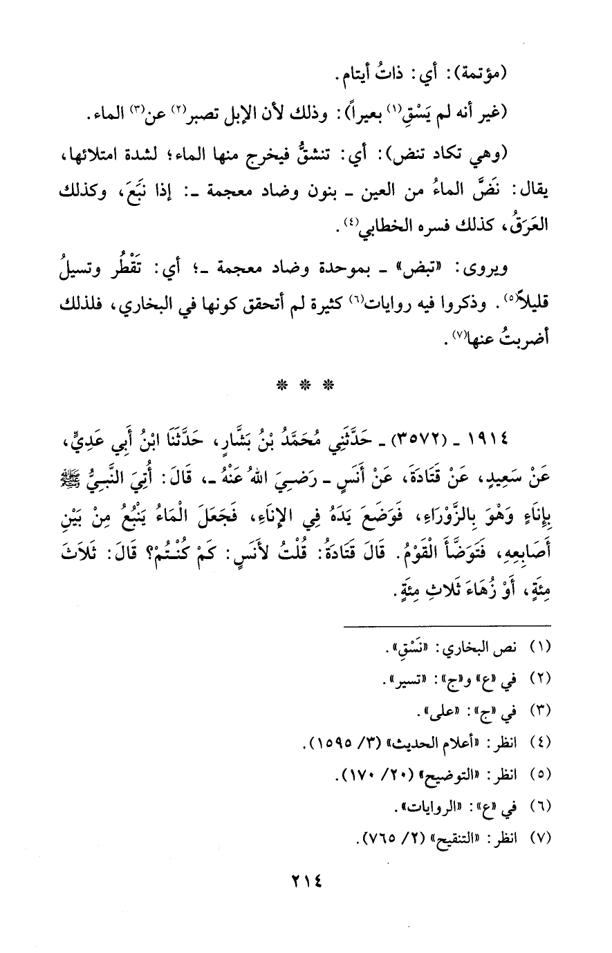 1914 - (3572) - حَدَّثَنِي مُحَمَّدُ بْنُ بَشَّارٍ، حَدَّثَنَا ابْنُ أَبِي عَدِيٍّ، عَنْ سَعِيدٍ، عَنْ قَتَادَةَ، عَنْ أَنس - رضي الله عنه -، قَالَ: أتيَ النَّبِي - صلى الله عليه وسلم - بِإِنَاءٍ وَهْوَ بالزَّوْرَاءِ، فَوَضَعَ يَدَهُ فِي الإنَاءِ، فَجَعَلَ الْمَاءُ يَنْبع مِنْ بَيْنِ أَصَابِعِهِ، فتَوَضَّأَ الْقَوْمُ. قَالَ قتادَةُ: قُلْتُ لأَنس: كَمْ كنْتُمْ؟ قَالَ: ثَلَاثَ مِئَةٍ، أَوْ زُهَاءَ ثَلاثِ مِئَةٍ.