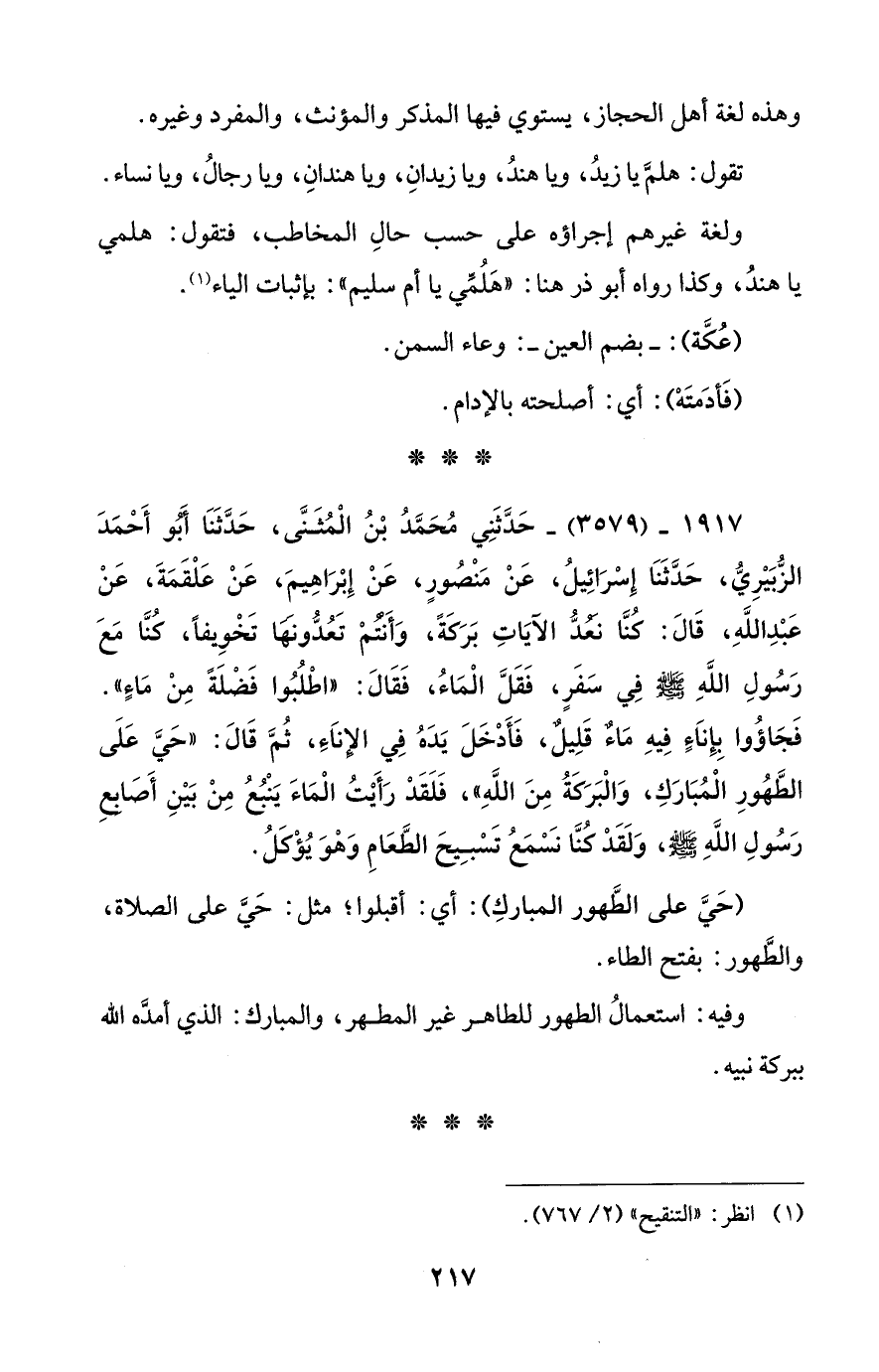 1917 - (3579) - حَدَّثَنِي مُحَمَّدُ بْنُ الْمُثَنَّى، حَدَّثَنَا أَبُو أَحْمَدَ الزُّبَيْرِيُّ، حَدَّثَنَا إِسْرَائِيلُ، عَنْ مَنْصُورٍ، عَنْ إِبْرَاهِيمَ، عَنْ عَلْقَمَةَ، عَنْ عَبْدِ اللَّهِ، قَالَ: كُنَّا نَعُدُّ الآيَاتِ بَرَكَةً، وَأَنْتُمْ تَعُدُّونها تَخْوِيفًا، كُنَّا مَعَ رَسُولِ اللَّهِ - صلى الله عليه وسلم - فِي سَفَرٍ، فَقَلَّ الْمَاءُ، فَقَالَ: "اطْلُبُوا فَضْلَةً مِنْ مَاءٍ". فَجَاؤُوا بِإِنَاءٍ فِيهِ مَاءٌ قَلِيلٌ، فَأَدْخَلَ يَدَهُ فِي الإِنَاءِ، ثُمَّ قَالَ: "حَيَّ عَلَى الطَّهُورِ الْمُبَارَكِ، وَالْبَرَكَةُ مِنَ اللَّهِ"، فَلَقَدْ رَأَيْتُ الْمَاءَ يَنْبُعُ مِنْ بَيْنِ أَصَابِعِ رَسُولِ اللَّهِ - صلى الله عليه وسلم -، وَلَقَدْ كنَّا نَسْمَعُ تَسْبِيحَ الطَّعَامِ وَهْوَ يُؤْكَلُ.