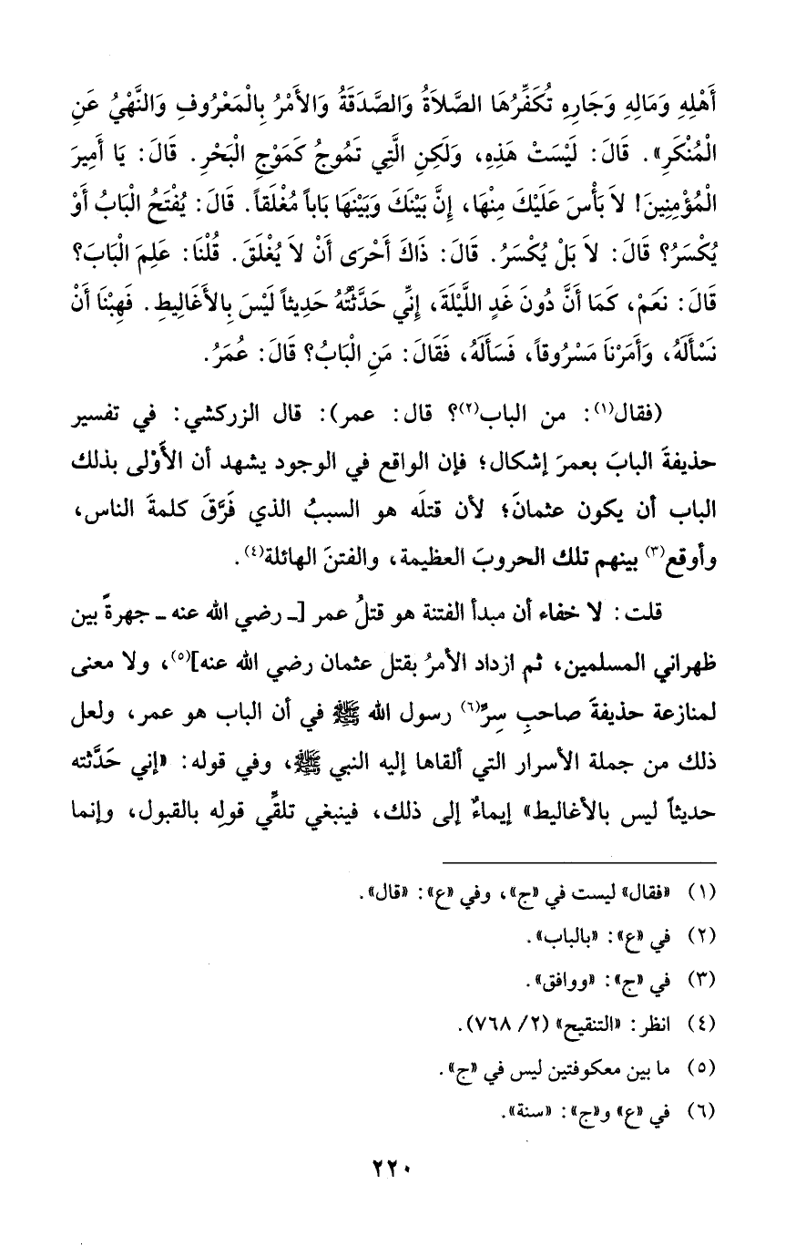 قلت: لا خفاء أن مبدأ الفتنة هو قتلُ عمر [- رضي الله عنه - جهرةً بين ظهراني المسلمين, ثم ازداد الأمرُ بقتل عثمان - رضي الله عنه -] (¬5)، ولا معنى لمنازعة حذيفةَ صاحبِ سِرٍّ (¬6) رسول الله - صلى الله عليه وسلم - في أن الباب هو عمر، ولعل ذلك من جملة الأسرار التي ألقاها إليه النبي - صلى الله عليه وسلم -، وفي قوله: "إني حَدَّثته حديثًا ليس بالأغاليط" إيماءٌ إلى ذلك، فينبغي تلقِّي قوله بالقبول، وإنما