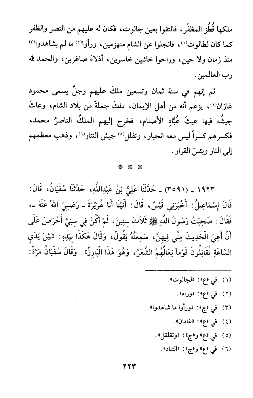 1923 - (3591) - حَدَّثَنَا عَلِيُّ بْنُ عَبْدِ اللَّهِ، حَدَّثَنَا سُفْيَانُ، قَالَ: قَالَ إِسْمَاعِيلُ: أَخْبَرَنِي قَيْسٌ، قَالَ: أَتَيْنَا أَبَا هُرَيْرَةَ - رضي الله عنه -، فَقَالَ: صحبت رَسُولَ اللَّهِ - صلى الله عليه وسلم - ثَلَاثَ سِنِينَ، لَمْ أَكُنْ فِي سِنِيَّ أَحْرَصَ عَلَى أَنْ أَعِيَ الْحَدِيثَ مِنِّي فِيهِنَّ، سَمِعْتُهُ يَقُولُ، وَقَالَ هَكَذَا بِيَدِهِ: "بَيْنَ يَدَيِ السَّاعَةِ تُقَاتِلُونَ قَوْمًا نِعَالُهُمُ الشَّعَرُ، وَهُوَ هَذَا الْبَارِزُ". وَقَالَ سُفْيَانُ مَرَّةً:
