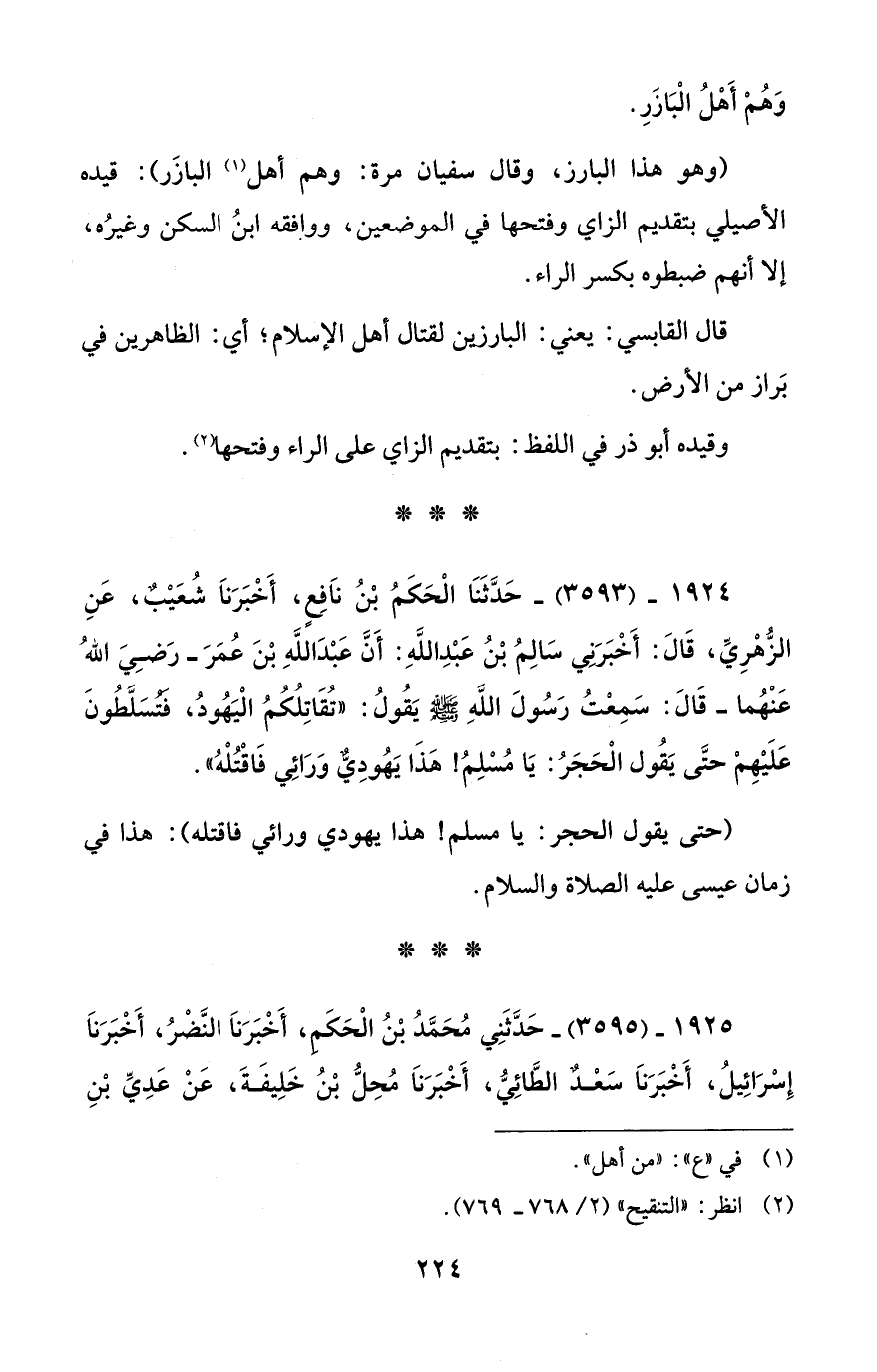1924 - (3593) - حَدَّثَنَا الْحَكَمُ بْنُ نَافِعٍ، أَخْبَرَنَا شُعَيْبٌ، عَنِ الزُّهْرِيِّ، قَالَ: أَخْبَرَنِي سَالِمُ بْنُ عَبْدِ اللَّهِ: أَنَّ عَبْدَ اللَّهِ بْنَ عُمَرَ -رَضِيَ اللهُ عَنْهُما- قَالَ: سَمِعْتُ رَسُولَ اللَّهِ - صلى الله عليه وسلم - يَقُولُ: "تُقَاتِلُكُمُ الْيَهُودُ، فَتُسَلَّطُونَ عَلَيْهِمْ حتَّى يَقُول الْحَجَرُ: يَا مُسْلِمُ! هَذَا يَهُودِيٌّ وَرَائِي فَاقْتُلْهُ".