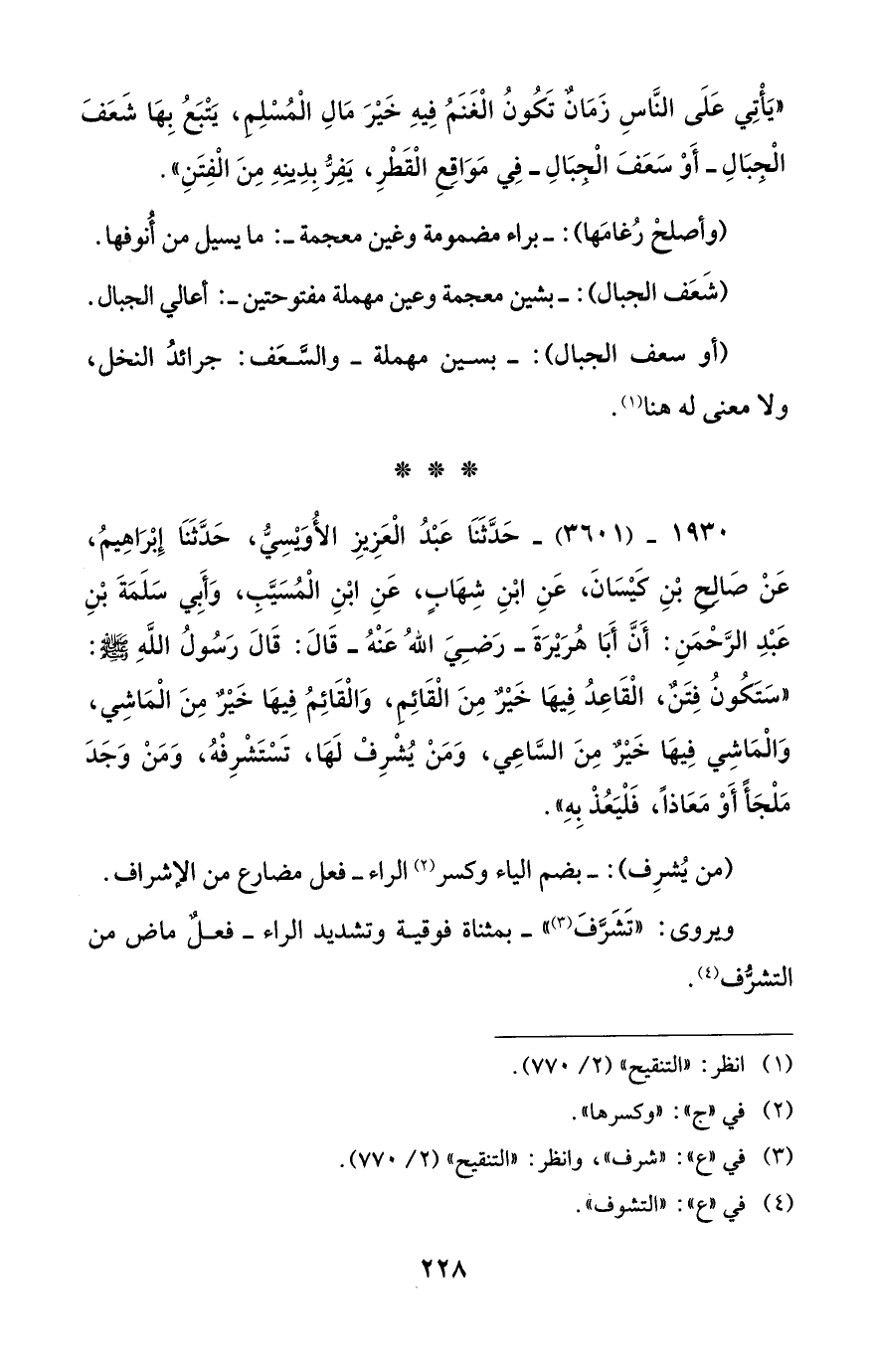 1930 - (3601) - حَدَّثَنَا عَبْدُ الْعَزِيزِ الأُويْسِيُّ، حَدَّثَنَا إِبْرَاهِيمُ، عَنْ صَالِحِ بْنِ كَيْسَانَ، عَنِ ابْنِ شِهَابٍ، عَنِ ابْنِ الْمُسَيَّبِ، وَأَبي سَلَمَةَ بْنِ عَبْدِ الرَّحْمَنِ: أَنَّ أَبَا هُرَيْرَةَ - رضي الله عنه - قَالَ: قَالَ رَسُولُ اللَّهِ - صلى الله عليه وسلم -: "سَتَكُونُ فِتَنٌ، الْقَاعِدُ فِيهَا خَيْرٌ مِنَ الْقَائِمِ، وَالْقَائِمُ فِيهَا خَيْرٌ مِنَ الْمَاشِي، وَالْمَاشِي فِيهَا خَيْرٌ مِنَ السَّاعِي، وَمَنْ يُشْرِفْ لَهَا، تَسْتَشْرِفْهُ، وَمَنْ وَجَدَ مَلْجَأً أَوْ مَعَاذًا، فَلْيَعُذْ بِهِ".