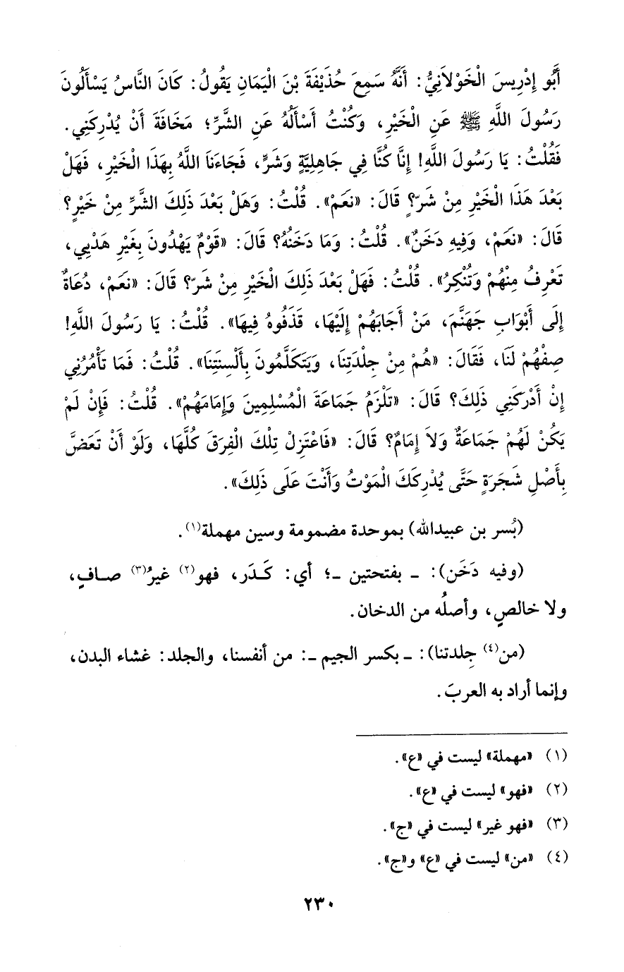 أَبُو إِدْرِيسَ الْخَوْلَانِيُّ: أَنَّهُ سَمِعَ حُذَيْفَةَ بْنَ الْيَمَانِ يَقُولُ: كَانَ النَّاسُ يَسْأَلُونَ رَسُولَ اللَّهِ - صلى الله عليه وسلم - عَنِ الْخَيْرِ، وَكُنْتُ أَسْأَلُهُ عَنِ الشَّرِّ؛ مَخَافَةَ أَن يُدْرِكَنِي. فَقُلْتُ: يَا رَسُولَ اللَّهِ! إِنَّا كُنَّا فِي جَاهِلِيَّةٍ وَشَرٍّ، فَجَاءَنَا اللَّهُ بِهَذَا الْخَيْرِ، فَهَلْ بَعْدَ هَذَا الْخَيْرِ مِنْ شرٍّ؟ قَالَ: "نَعَمْ". قُلْتُ: وَهَلْ بَعْدَ ذَلِكَ الشَّرِّ مِنْ خَيْرٍ؟ قَالَ: "نَعَمْ، وَفِيهِ دَخَنٌ". قُلْتُ: وَمَا دَخَنُهُ؟ قَالَ: "قَوْمٌ يَهْدُونَ بِغَيْرِ هَدْيِي، تَعْرِفُ مِنْهُمْ وَتُنْكِرُ". قُلْتُ: فَهَلْ بَعْدَ ذَلِكَ الْخَيْرِ مِنْ شَرّ؟ قَالَ: "نَعَمْ، دُعَاةٌ إِلَى أَبْوَابِ جَهَنَّمَ، مَنْ أَجَابَهُمْ إِلَيْهَا، قَذَفُوهُ فِيهَا". قُلْتُ: يَا رَسُولَ اللَّهِ! صِفْهُمْ لَنَا، فَقَالَ: "هُمْ مِن جِلْدَتِنَا، وَيَتَكَلَّمُونَ بِأَلْسِنَتِنَا". قُلْتُ: فَمَا تَأْمُرُنِي إِنْ أَدْرَكَنِي ذَلِكَ؟ قَالَ: "تَلْزَمُ جَمَاعَةَ الْمُسْلِمِينَ وَإِمَامَهُمْ". قُلْتُ: فَإِنْ لَمْ يَكُنْ لَهُمْ جَمَاعَةٌ وَلا إِمَامٌ؟ قَالَ: "فَاعْتَزِلْ تِلْكَ الْفِرَقَ كُلَّهَا، وَلَوْ أَنْ تَعَضَّ بِأَصْلِ شَجَرَةٍ حَتَّى يُدْرِكَكَ الْمَوْتُ وَأَنْتَ عَلَى ذَلِكَ".