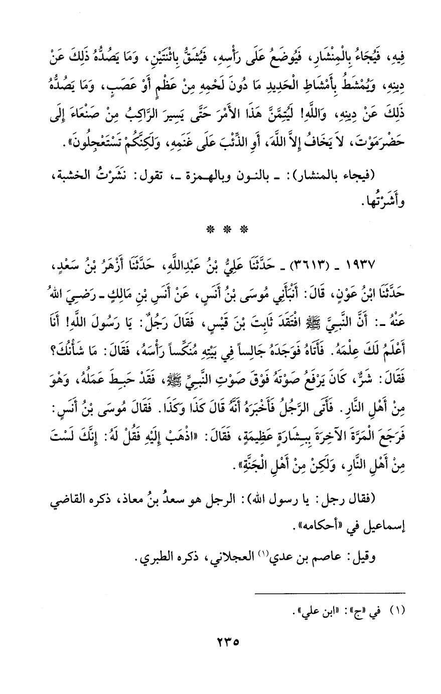 1937 - (3613) - حَدَّثَنَا عَلِي بْنُ عَبْدِ اللَّهِ، حَدَّثَنَا أَزْهَرُ بْنُ سَعْدٍ، حَدَّثَنَا ابْنُ عَوْنٍ، قَالَ: أَنْبَأَنِي مُوسَى بْنُ أَنَسٍ، عَنْ أَنَسِ بْنِ مَالِكٍ - رضي الله عنه -: أَنَّ النَّبِيَّ - صلى الله عليه وسلم - افْتَقَدَ ثَابِتَ بْنَ قَيْسٍ، فَقَالَ رَجُلٌ: يَا رَسُولَ اللَّهِ! أَنَا أَعْلَمُ لَكَ عِلْمَهُ. فَأَتَاهُ فَوَجَدَهُ جَالِسًا فِي بَيْتِهِ مُنَكِّسًا رَأْسَهُ، فَقَالَ: مَا شَأْنُكَ؟ فَقَالَ: شَرٌّ، كَانَ يَرْفَعُ صَوْتَهُ فَوْقَ صَوْتِ النَّبِي - صلى الله عليه وسلم -، فَقَدْ حَبِطَ عَمَلُهُ، وَهْوَ مِن أَهْلِ النَّارِ. فَأَتَى الرَّجُلُ فَأَخْبَرَهُ أَنَّهُ قَالَ كَذَا وَكَذَا. فَقَالَ مُوسىَ بْنُ أَنَسٍ: فَرَجَعَ الْمَرَّةَ الآخِرَةَ بِبِشَارَةٍ عَظِيمَةٍ، فَقَالَ: "اذْهَبْ إِلَيهِ فَقُلْ لَهُ: إِنَّكَ لَسْتَ مِن أَهْلِ النَّارِ، وَلَكِنْ مِنْ أَهْلِ الْجَنَّةِ".