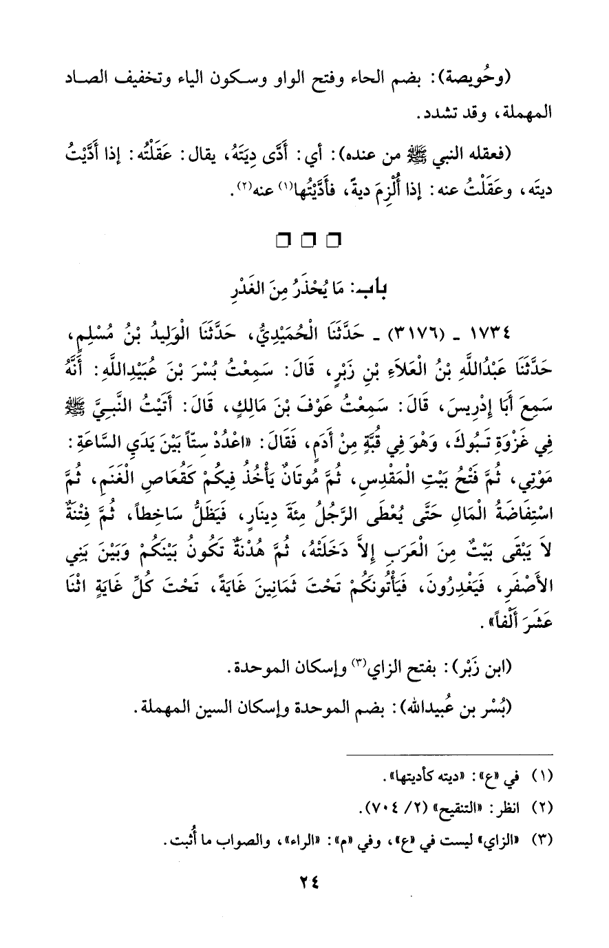 1734 - (3176) - حَدَّثَنَا الْحُمَيْدِيُّ، حَدَّثَنَا الْوَلِيدُ بْنُ مُسْلِمٍ، حَدَّثَنَا عَبْدُ اللهِ بْنُ الْعَلاَءِ بْنِ زَبْرٍ، قَالَ: سَمِعْتُ بُسْرَ بْنَ عُبَيْدِ اللهِ: أَنَّهُ سَمِعَ أَبَا إِدْرِيسَ، قَالَ: سَمِعْتُ عَوْفَ بْنَ مَالِكٍ، قَالَ: أَتَيْتُ النَّبِيَّ - صلى الله عليه وسلم - فِي غَزْوَةِ تَبُوكَ، وَهْوَ فِي قُبَّهٍ مِنْ أَدَمٍ، فَقَالَ: "اعْدُدْ سِتّاً بَيْنَ يَدَيِ السَاعَةِ: مَؤْتِي، ثُمَّ فَتْحُ بَيْتِ الْمَقْدِسِ، ثُمَّ مُوتَانٌ يَأْخُذُ فِيكُمْ كَقُعَاصِ الْغَنَمِ، ثُمَّ اسْتِفَاضَةُ الْمَالِ حَتَّى يُعْطَى الرَّجُلُ مِئَةَ دِينَارٍ، فَيَظَلُّ سَاخِطاً، ثُمَّ فِتْنَةٌ لاَ يَبْقَى بَيْتٌ مِنَ الْعَرَبِ إِلاَّ دَخَلَتْهُ، ثُمَّ هُدْنَةٌ تَكُونُ بَيْنَكُمْ وَبَيْنَ بَنِي الأَصْفَرِ، فَيَغْدِرُونَ، فَيَأْتُونَكُمْ تَحْتَ ثَمَانِينَ غَايَةً، تَحْتَ كُلِّ غَايَةٍ اثْنَا عَشَرَ أَلْفاً".