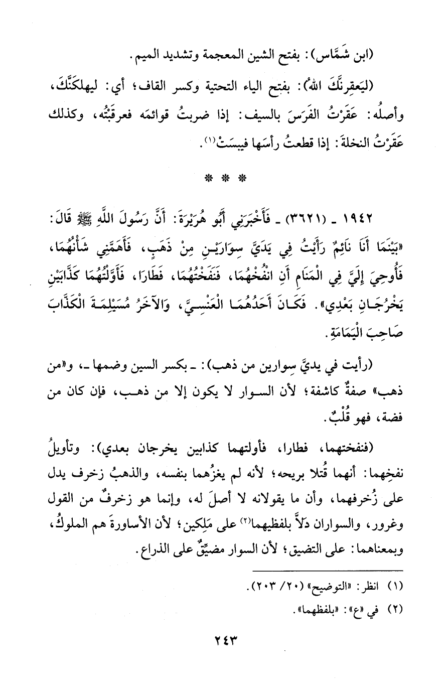 1942 - (3621) - فَأَخْبَرَنِي أَبُو هُرَيْرَةَ: أَنَّ رَسُولَ اللَّهِ - صلى الله عليه وسلم - قَالَ: "بَيْنَمَا أَنَا نَائِمٌ رَأَيْتُ فِي يَدَيَّ سِوَارَيْنِ مِنْ ذَهَبٍ، فَأَهَمَّنِي شَأْنُهُمَا، فَأُوحِيَ إِلَيَّ فِي الْمَنَامِ أَنِ انْفُخْهُمَا، فَنَفَختُهُمَا، فَطَارَا، فَأَوَّلْتُهُمَا كَذَّابَيْنِ يَخرُجَانِ بَعْدِي". فَكَانَ أَحَدُهُمَا الْعَنْسِيَّ، وَالآخَرُ مُسَيْلِمَةَ الْكَذَّابَ صَاحِبَ الْيَمَامَةِ.
