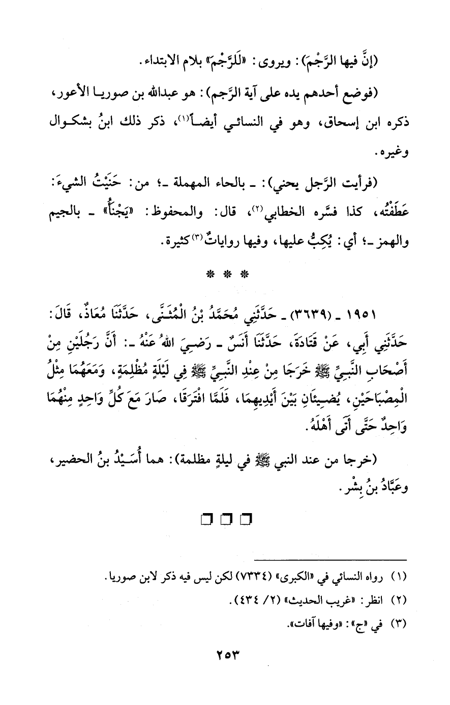 1951 - (3639) - حَدَّثَنِي مُحَمَّدُ بْنُ الْمُثَنَّى، حَدَّثَنَا مُعَاذٌ، قَالَ: حَدَّثَنِي أَبِي، عَنْ قَتَادَةَ، حَدَّثَنَا أَنَسٌ - رضي الله عنه -: أَنَّ رَجُلَيْنِ مِنْ أَصْحَابِ النَّبِيِّ - صلى الله عليه وسلم - خَرَجَا مِنْ عِنْدِ النَّبِيِّ - صلى الله عليه وسلم - فِي لَيْلَةٍ مُظْلِمَةٍ، وَمَعَهُمَا مِثْلُ الْمِصْبَاحَيْنِ، يُضِيئَانِ بَيْنَ أَيْدِيهِمَا، فَلَمَّا افْتَرَقَا، صَارَ مَعَ كُلِّ وَاحِدٍ مِنْهُمَا وَاحِدٌ حَتَّى أَتَى أَهْلَهُ.
