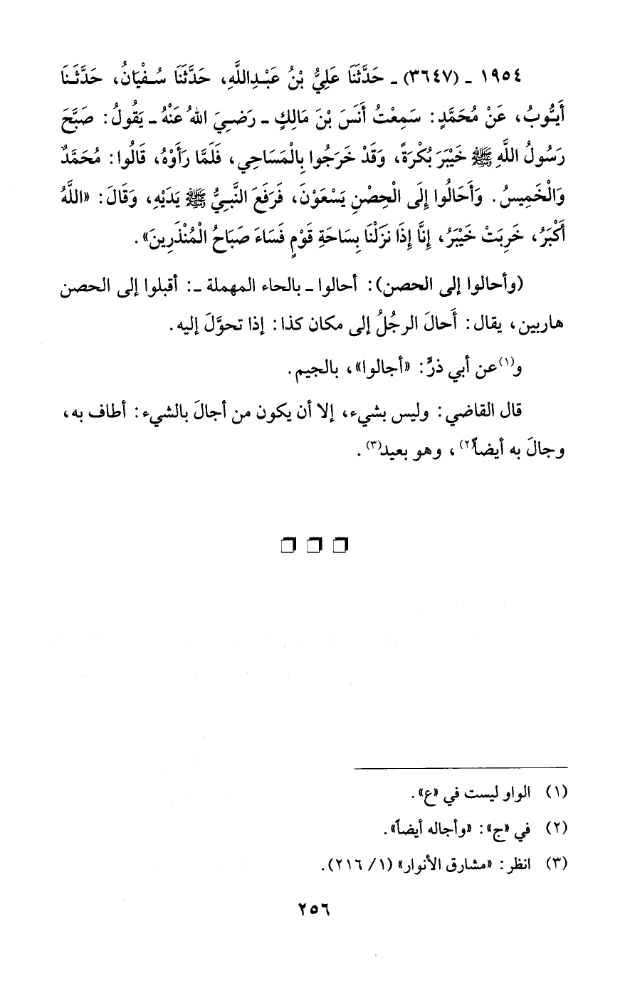 1954 - (3647) - حَدَّثَنَا عَلِيُّ بْنُ عَبْدِ اللَّهِ، حَدَّثَنَا سُفْيَانُ، حَدَّثَنَا أَيُّوبُ، عَنْ مُحَمَّدٍ: سَمِعْتُ أَنَسَ بْنَ مَالِكٍ - رضي الله عنه - يَقُولُ: صَبَّحَ رَسُولُ اللَّهِ - صلى الله عليه وسلم - خَيْبَرَ بُكْرَةً، وَقَدْ خَرَجُوا بِالْمَسَاحِي، فَلَمَّا رَأَوْهُ، قَالُوا: مُحَمَّدٌ وَالْخَمِيسُ. وَأَحَالُوا إِلَى الْحِصْنِ يَسْعَوْنَ، فَرَفَعَ النَّبِيُّ - صلى الله عليه وسلم - يَدَيْهِ، وَقَالَ: "اللَّهُ أَكْبَرُ، خَرِبَتْ خَيْبَرُ، إِنَّا إِذَا نزَلْنَا بِسَاحَةِ قَوْمٍ فَسَاءَ صَبَاحُ الْمُنْذَرِينَ".