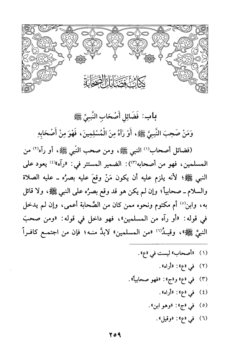 (فضائل أصحاب (¬1) النبي - صلى الله عليه وسلم -، ومن صحب النّبي - صلى الله عليه وسلم -، أَو رآه (¬2) من المسلمين، فهو من أصحابه (¬3)): الضمير المستتر في: "رآه" (¬4) يعود على النبي - صلى الله عليه وسلم -؛ لأنه يلزم عليه أن يكون مَنْ وقعَ عليه بصرُه -عليه الصلاة والسلام- صحابيًا؛ وإن لم يكن هو قد وقع بصرُه على النبي - صلى الله عليه وسلم -، ولا قائل به، وابن (¬5) أم مكتوم ونحوه ممن كان من الصَّحابة أعمى، وإن لم يدخل في قوله: "أو رآه من المسلمين"، فهو داخل في قوله: "ومن صحبَ النبيَّ - صلى الله عليه وسلم -"، وقيدُ (¬6) "من المسلمين" لابدَّ منه؛ فإن من اجتمع كافرًا