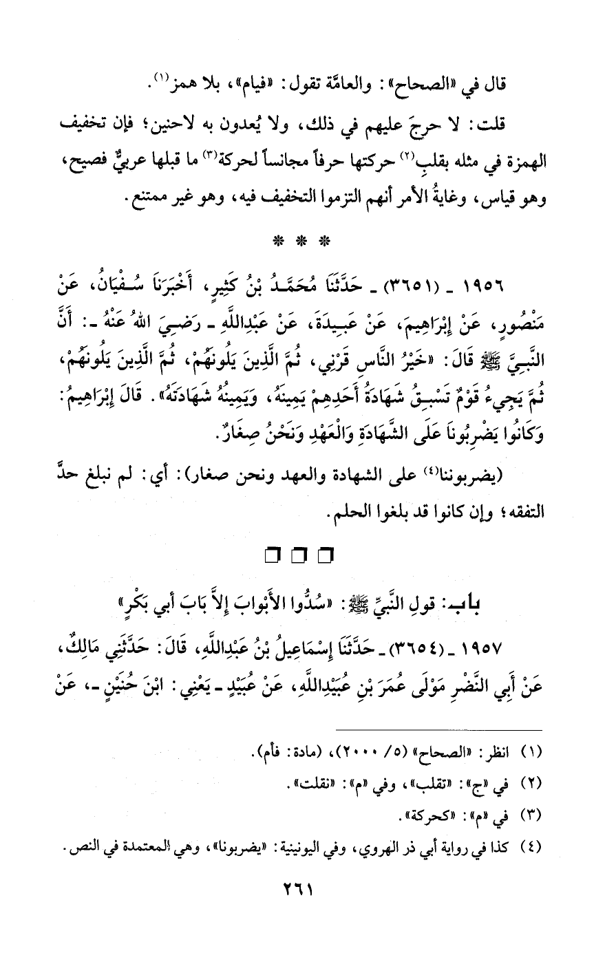 1956 - (3651) - حَدَّثَنَا مُحَمَّدُ بْنُ كَثِيرٍ، أَخْبَرَنَا سُفْيَانُ، عَنْ مَنْصُورٍ، عَنْ إِبْرَاهِيمَ، عَنْ عَبِيدَةَ، عَنْ عَبْدِ اللَّهِ - رضي الله عنه -: أَنَّ النَّبِيَّ - صلى الله عليه وسلم - قَالَ: "خَيْرُ النَّاسِ قَرْنِي، ثُمَّ الَّذِينَ يَلُونَهُمْ، ثُمَّ الَّذِينَ يَلُونَهُمْ، ثُمَّ يَجِيءُ قَوْمٌ تَسْبِقُ شَهَادَةُ أَحَدِهِمْ يَمِينَهُ، وَيَمِينُهُ شَهَادَتَهُ". قَالَ إِبْرَاهِيمُ: وَكَانُوا يَضْرِبُونَا عَلَى الشَّهَادَةِ وَالْعَهْدِ وَنَحْنُ صِغَارٌ.