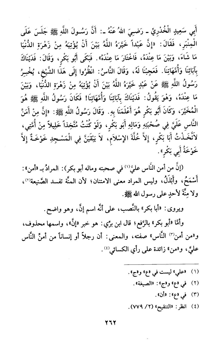 أَبِي سَعِيدٍ الْخُدْرِيِّ - رضي الله عنه -: أَنَّ رَسُولَ اللَّهِ - صلى الله عليه وسلم - جَلَسَ عَلَى الْمِنْبَرِ، فَقَالَ: "إِنَّ عَبْدًا خَيَّرَهُ اللَّهُ بَيْنَ أَنْ يُؤْتِيَهُ مِنْ زَهْرَةِ الدُّنْيَا مَا شَاءَ، وَبَيْنَ مَا عِنْدَهُ، فَاخْتَارَ مَا عِنْدَهُ". فَبَكَى أَبُو بَكرٍ، وَقَالَ: فَدَيْنَاكَ بِآبَائِنَا وَأمُّهَاتِنَا. فَعَجِبْنَا لَهُ، وَقَالَ النَّاسُ: انْظُرُوا إِلَى هَذَا الشَّيْخِ، يُخْبِرُ رَسُولُ اللَّهِ - صلى الله عليه وسلم - عَنْ عَبْدٍ خَيَّرَهُ اللَّهُ بَيْنَ أَنْ يُؤْتِيَهُ مِنْ زَهْرَةِ الدُّنْيَا، وَبَيْنَ مَا عِنْدَهُ، وَهْوَ يَقُولُ: فَدَيْنَاكَ بِآبَائِنَا وَأُمَّهَاتِنَا! فَكَانَ رَسُولُ اللَّهِ - صلى الله عليه وسلم - هُوَ الْمُخَيَّرَ، وَكَانَ أَبُو بَكْرٍ هُوَ أَعْلَمَنَا بِهِ. وَقَالَ رَسُولُ اللَّهِ - صلى الله عليه وسلم -: "إِنَّ مِنْ أَمَنِّ النَّاسِ عَلَيَّ فِي صُحْبَتِهِ وَمَالِهِ أَبَو بَكْرٍ، وَلَوْ كُنْتُ مُتَّخِذًا خَلِيلًا مِنْ أُمَّتِي، لَاتَّخَذْتُ أَبَا بَكرٍ، إِلَّا خُلَّةَ الإِسْلَامِ، لَا يَبْقَيَنَّ فِي الْمَسْجِدِ خَوْخَةٌ إِلَّا خَوْخَةُ أَبي بَكْرٍ".